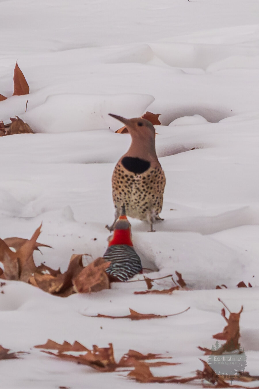 Northern Flicker (top) Yellow-bellied Sapsucker(bottom) Both of these species are considered woodpeckers but the Northern Flicker prefers foraging on the ground for grubs and worms. The Flicker flew down and made a hole in the snow then proceeded to peck into the ground. It jumped out of the hole and then the Sapsucker flew down and looked around in the hole opportunistically hoping the Flicker had found something to eat. Then the Flicker turned around as if to say “What do you think you’re doing?!” This observation shows that even though sapsuckers prefer to peck on trees they will watch for opportunities elsewhere. Kinda interesting…