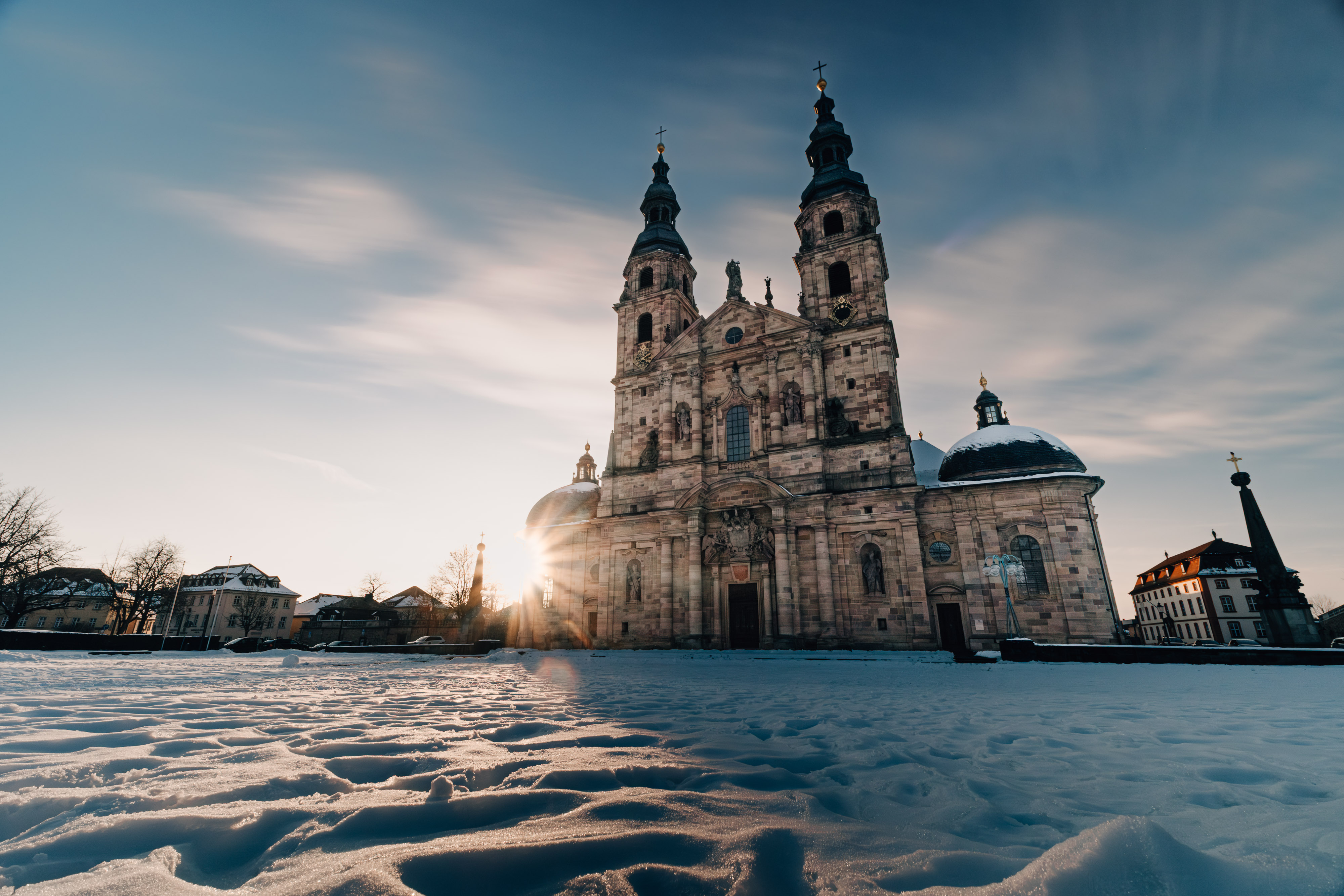 Eine Langzeitbelichtung des Fuldaer Doms, mit dem schneebedeckten Domplatz im Vordergrund.