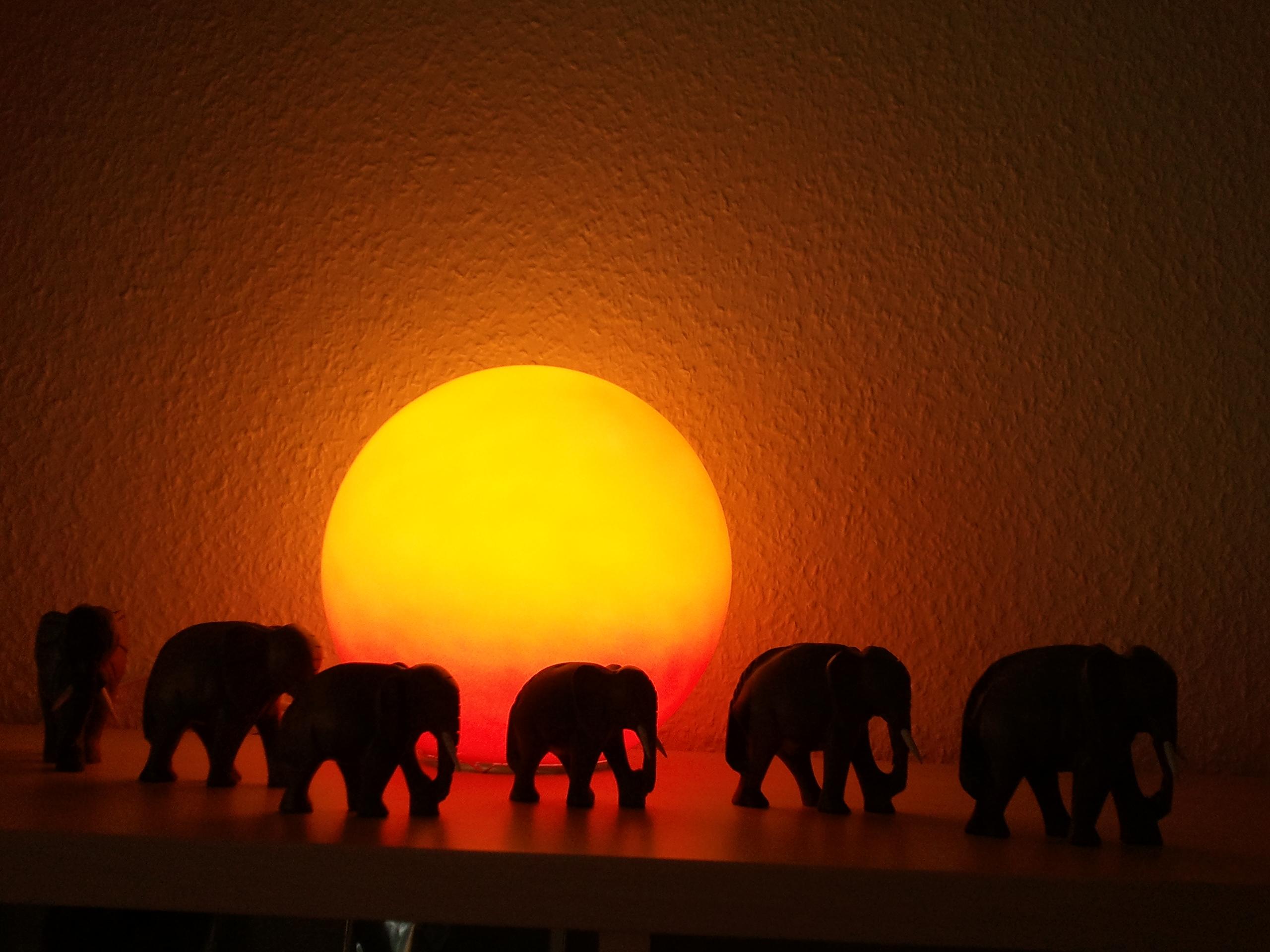 These are actually small wooden elephants in front of a lamp on a shelf. Smartphone photo, 2013.