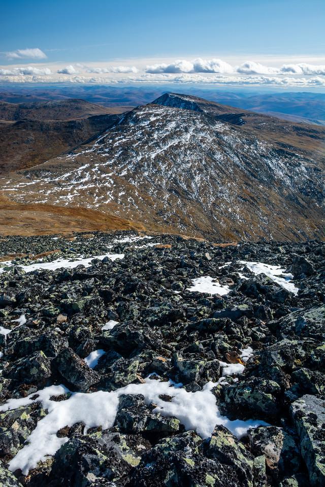 Early September snow begins to dust the White Mountains, adding contrast to the talus slopes in the hills near Nome Creek.