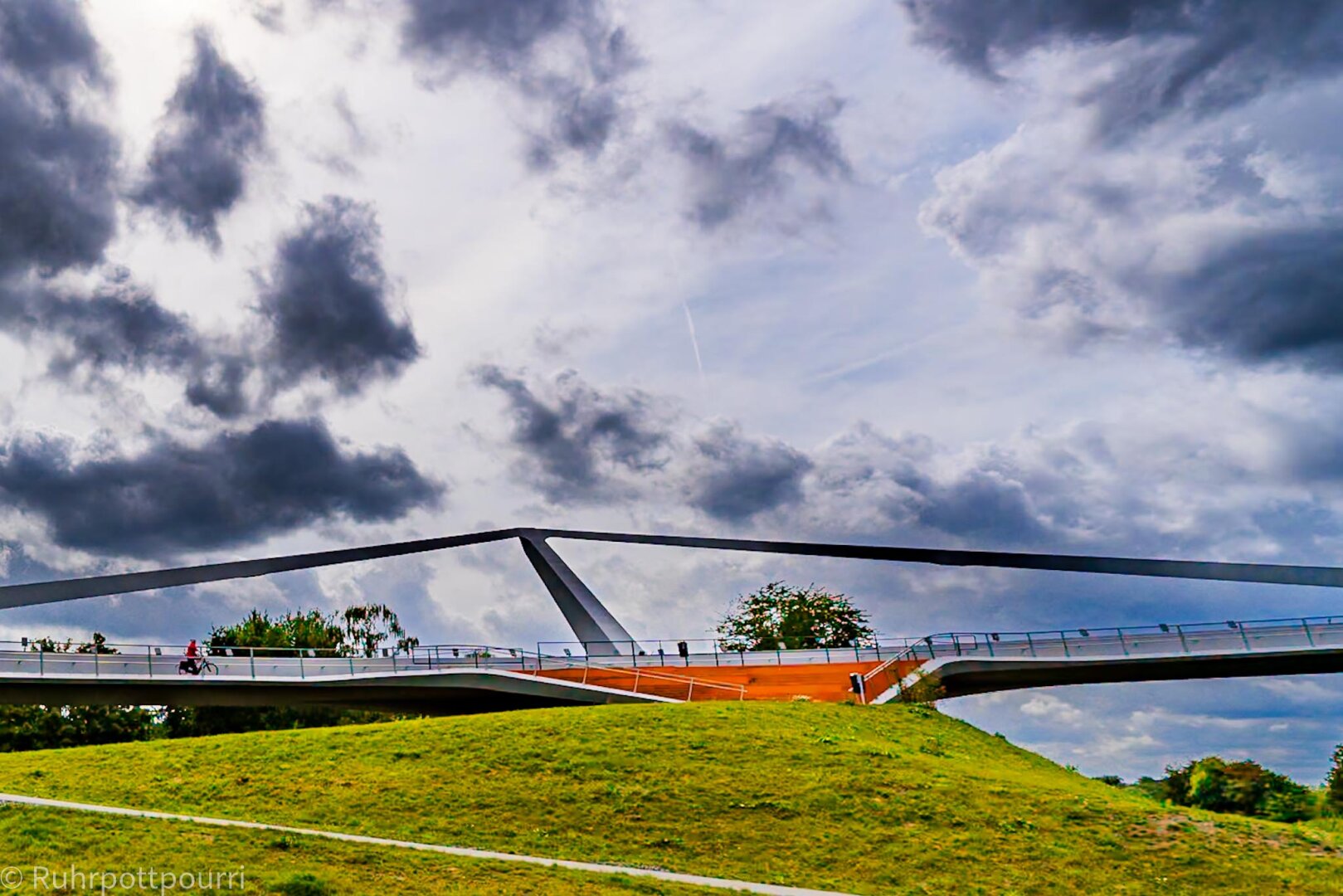 Der sogenannte "Sprung über die Emscher". Eine Fahrradbrücke die Teil eines Radweges entlang der , in Teilen, renaturierten Emscher ist.