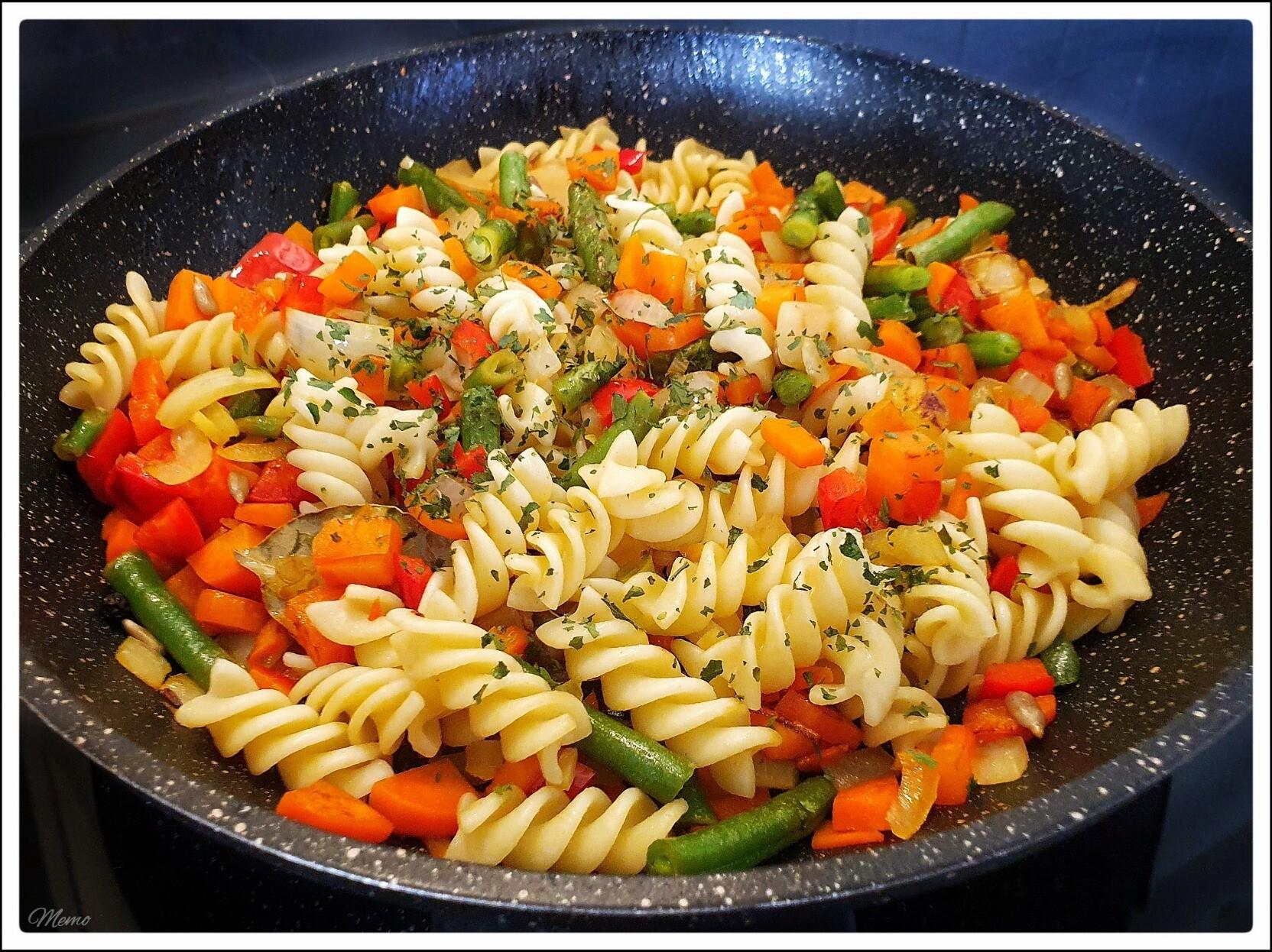 Nudeln, Brechbohnen, Möhren, rote Paprika, Zwiebel, Sonnenblumenkerne.