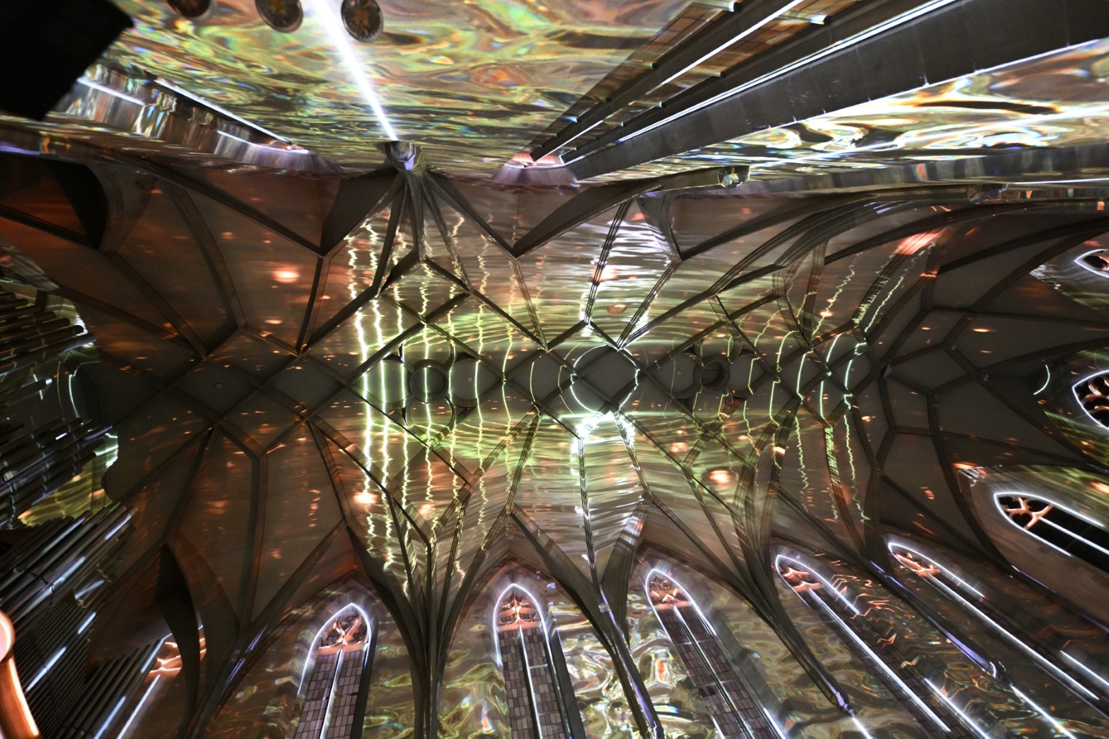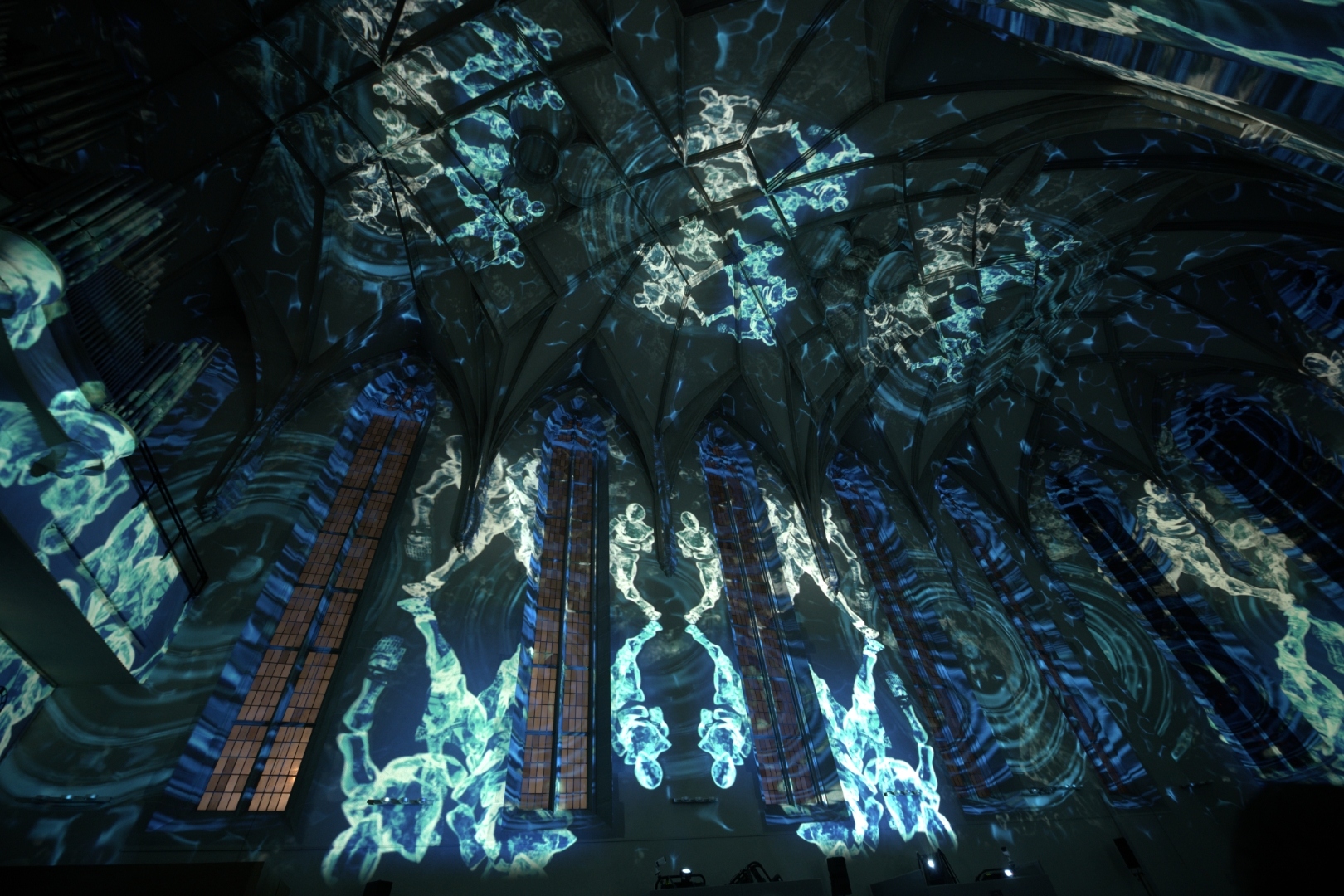 Lichtprojektion auf der Decke und die Waende einer leerstehenden Kirche. Die Fensterbögen sind weiss umrahmt, auf der Decke sind grüne wasserblumen zu sehen zu der Musik der Moldau