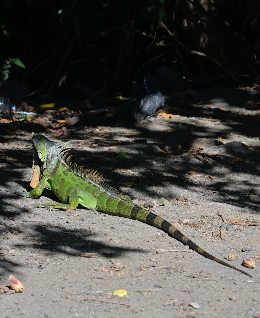 Grote groene leguaan die naar links kijkt, het hoofd naar boven