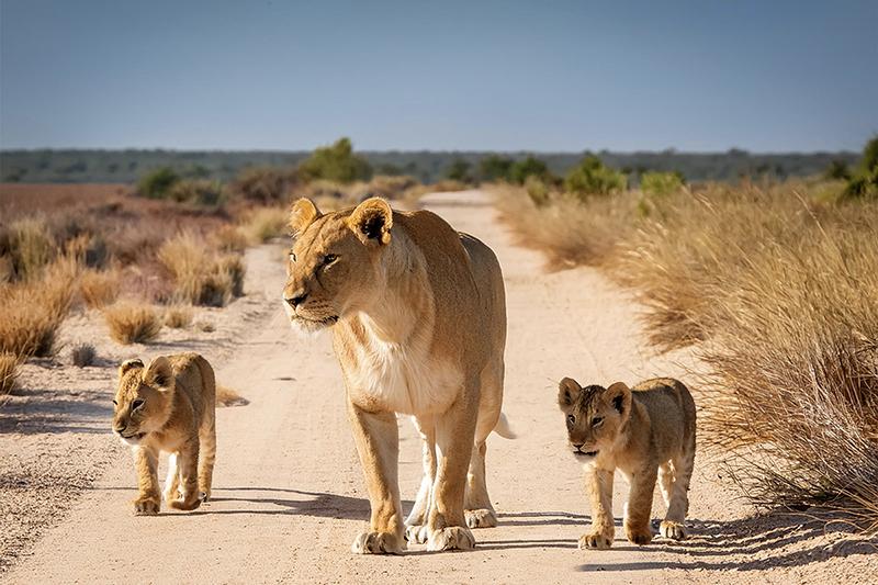 Lioness Walks with Two Cubs