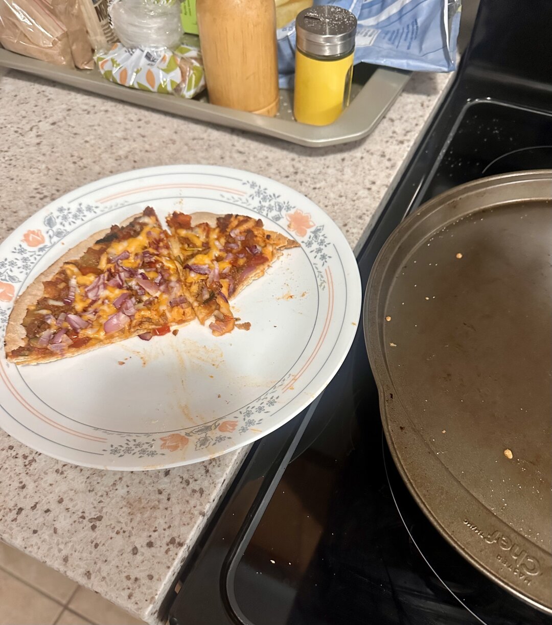 Three slices of pizza, partially eaten, rest on a white plate adorned with a floral and geometric pattern. The pizza features a rich tomato sauce, melted cheese, and scattered red onion pieces. To the right of the plate, a dark, round pizza pan, likely used for baking, sits on a black stovetop. Scattered crumbs are visible on both the pan and the speckled countertop. The scene evokes a casual, home-cooked meal setting.