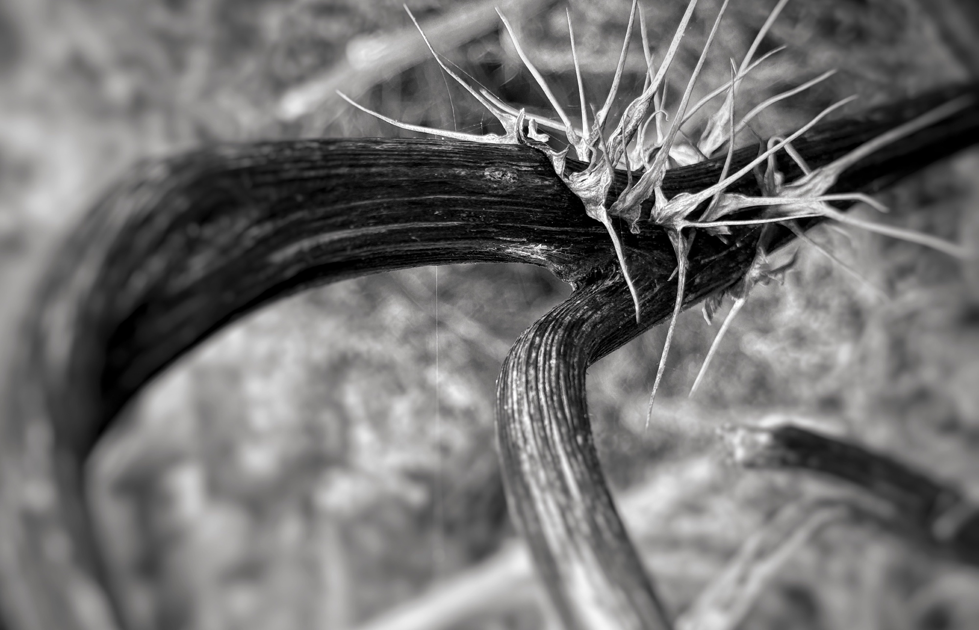 #BNWmacro Macro of a dead branch on a wild thistle. #EastCoastKin #ClassicMono #Macro #Thistle #Hiking