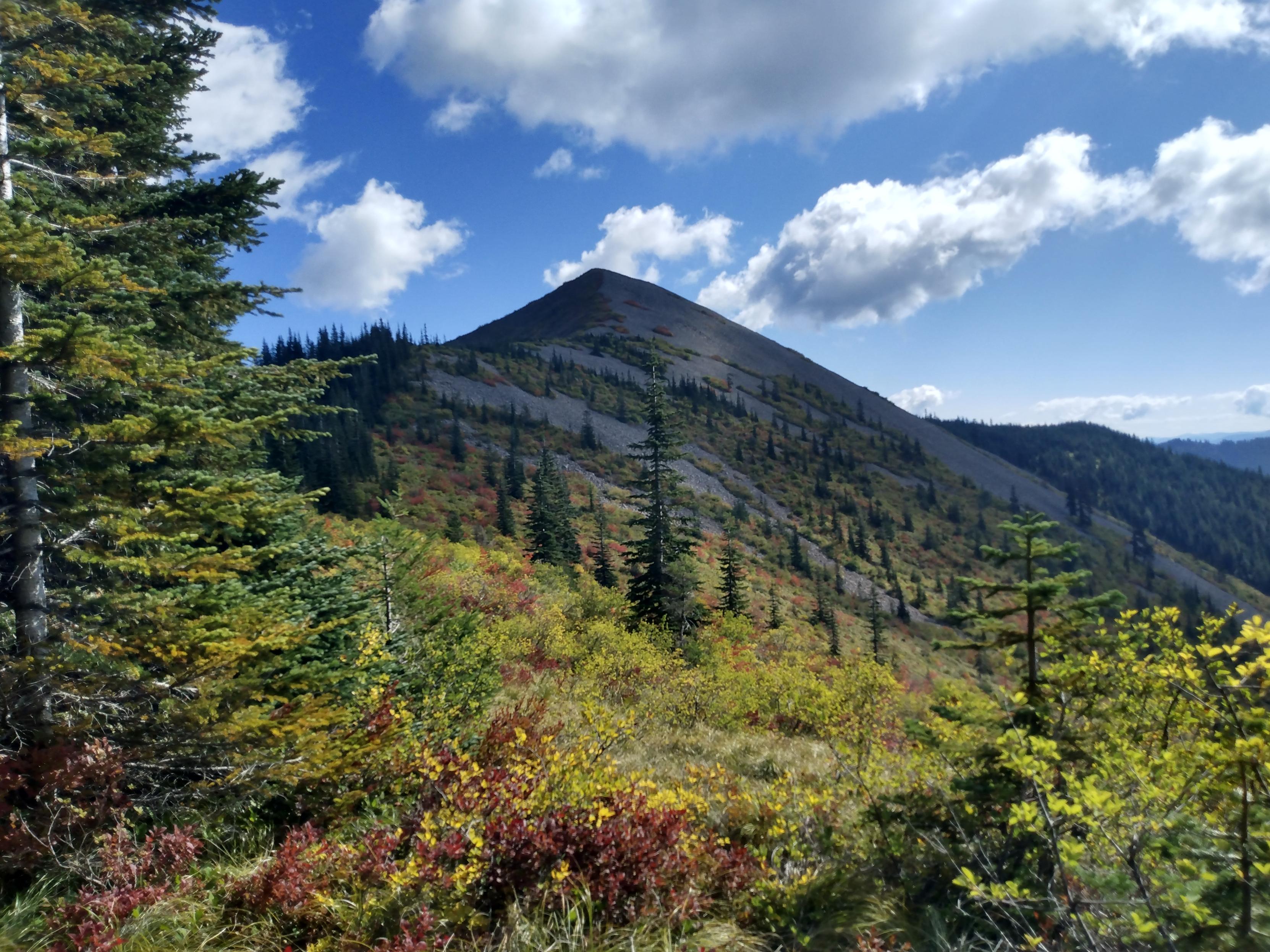Bluff Mountain, so named for its bare talus slopes, rises from a alpine ridge carpeted with green, yellow, and red berry bushes and a few subalpine fir trees. Fluffy clouds in a bright blue sky above.