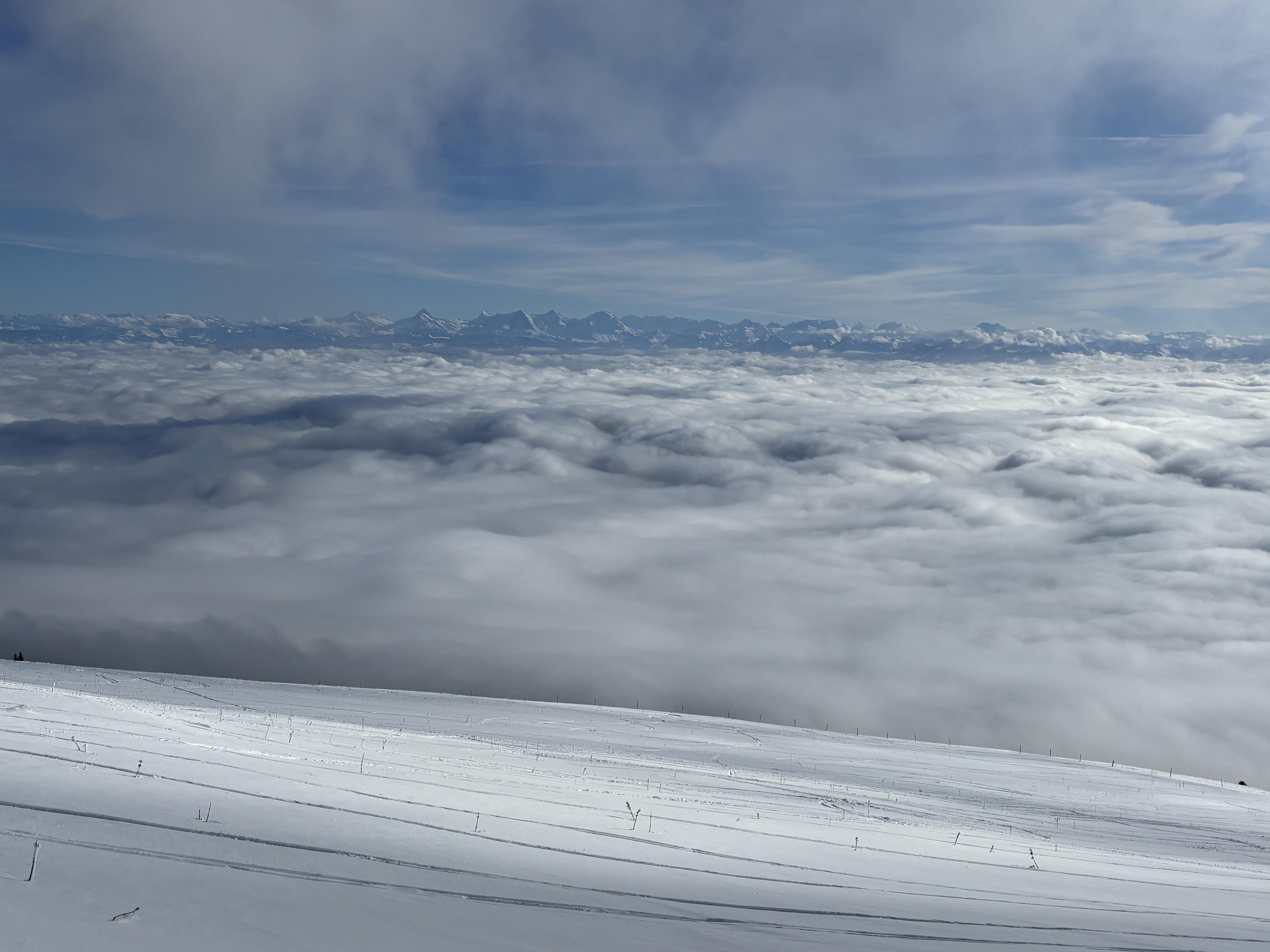 In einer Schneelandschaft 眉ber einem Wolkenmeer die Aussicht auf eine Bergkette der Alpen.