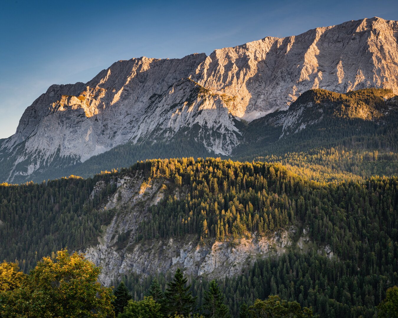 The mountains in the background are partially veiled by a gentle mist, their peaks glowing in the sunlight, creating a sense of depth and tranquility. The trees along the shoreline are lightly dusted with snow, their branches reaching out over the water, adding to the peaceful ambiance.