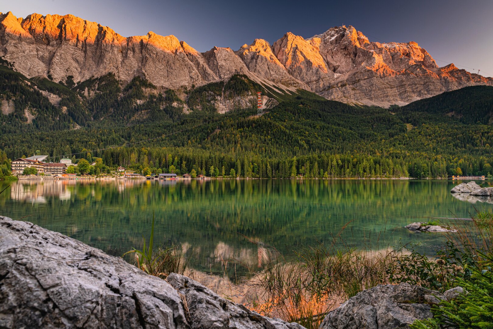 This breathtaking winter landscape captures a serene lakeside scene, bathed in the soft glow of early morning light. The calm, reflective waters of the lake stretch out toward the horizon, where majestic, snow-dusted mountains rise against the clear blue sky. A delicate layer of frost adorns the reeds and grasses in the foreground, their intricate patterns sparkling in the sunlight.