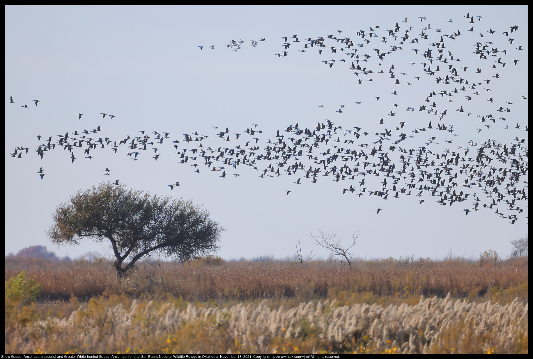 Snow Geese (Anser caerulescens), Greater White-fronted Geesse (Anser albifrons) at Salt Plains National Wildlife Refuge in Alfalfa County, Oklahoma, United States on November 18, 2021