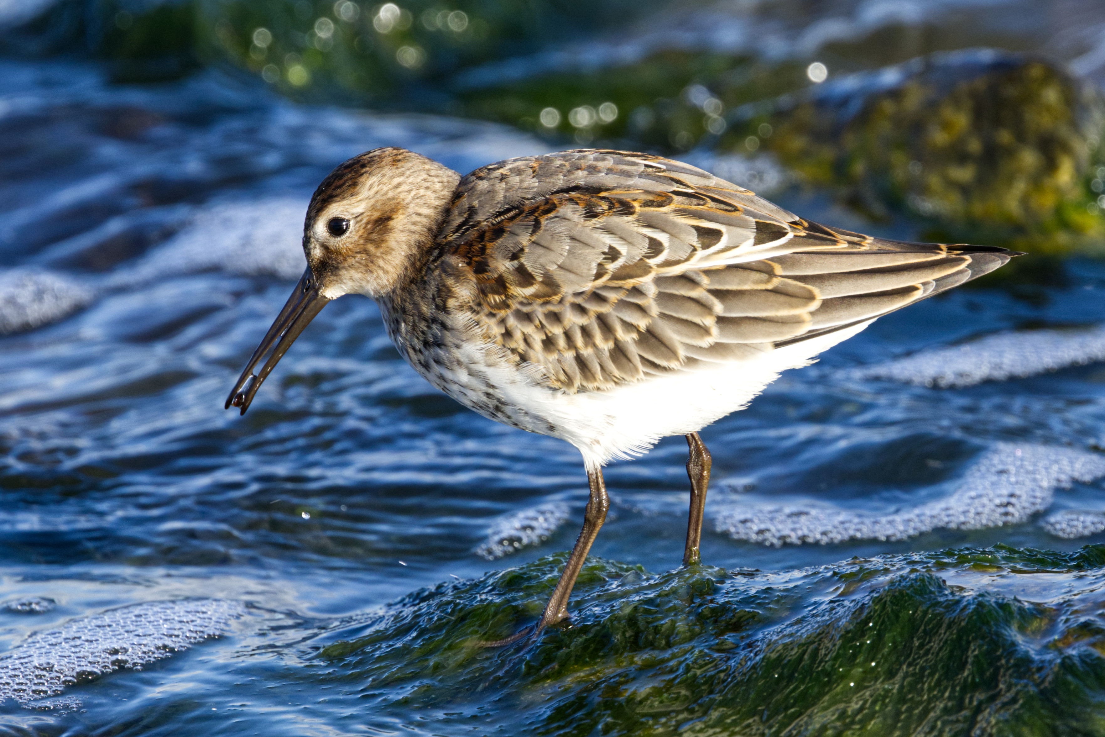 Ein Alpenstrandläufer (Calidris alpina) steht auf einem knapp aus dem Wasser der Ostsee ragenden, mit Algen überwachsenen Stein und hat eine kleine Schnecke im Schnabel. Der Alpenstrandläufer misst 17 bis 21 Zentimeter und ist damit etwa so groß wie ein Star. Die Flügelspannweite beträgt etwa 32 bis 36 Zentimeter. Der Vogel wiegt 40 bis 60 Gramm und kann bis zu 24 Jahre alt werden. Der lange, schwarze Schnabel ist im vorderen Viertel leicht nach unten gebogen. Die Iris ist braunschwarz. Lauf und die Zehen sind schwärzlich olivfarben. Im Schlichtkleid ist die Körperoberseite bei beiden Geschlechtern graubraun bis rauchgrau. Rötliche bis rotbraune Säume fehlen. Durch die dunklen Federschäfte wirken vor allem der Scheitel und der vordere Rücken fein gestrichelt. Kehle und Kinn sind weißlich. Der Hals ist gleichfalls weißlich, weist aber eine mehr oder weniger deutliche braune Längsstrichelung auf. Die Vorderbrust ist graubraun mit auffällig dunklen Schaftstreifen. Brust und Bauch sind weiß.