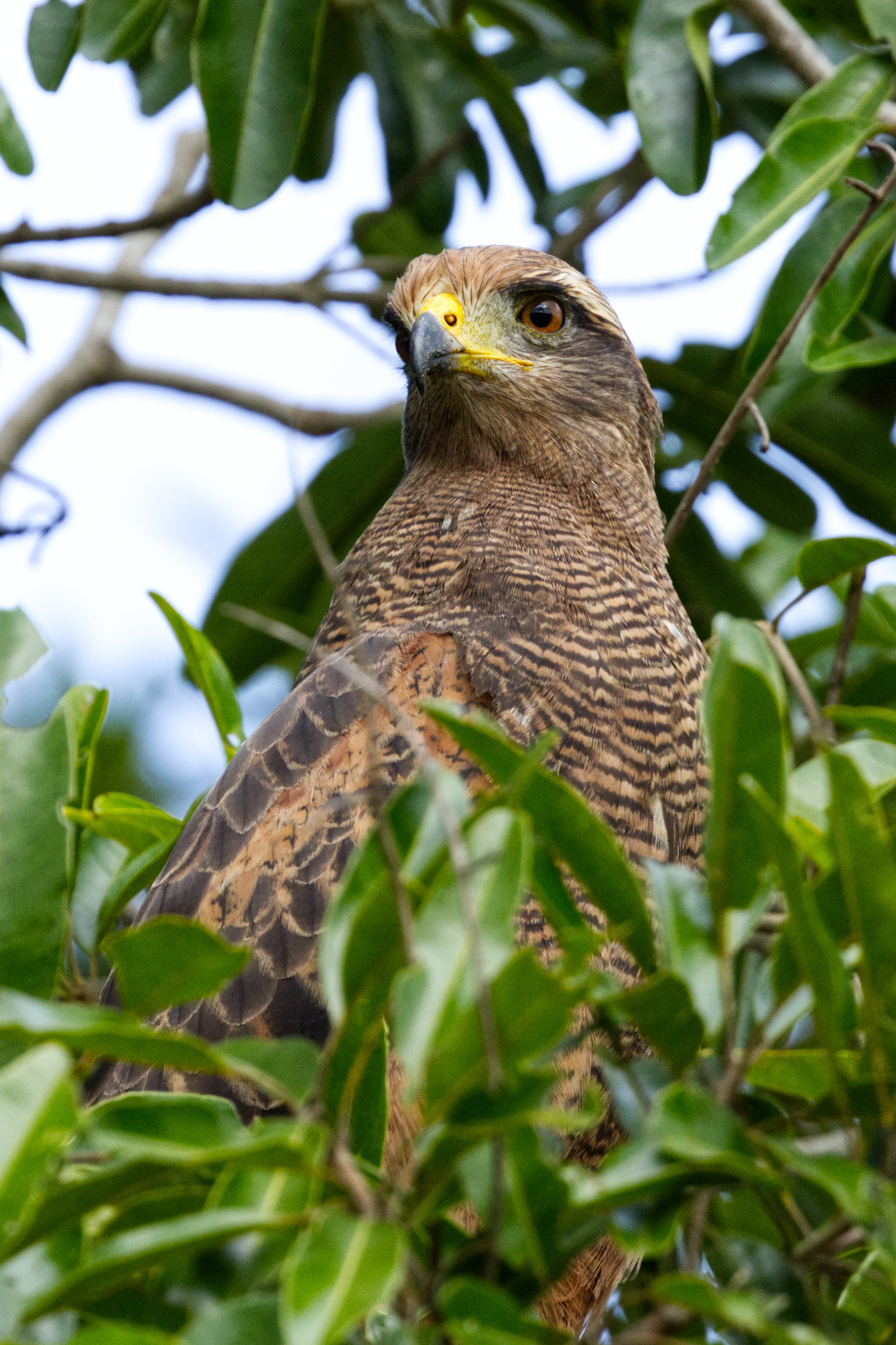 Ein Savannenbussard (Buteogallus meridionalis) schaut aus einem Busch heraus. Zu sehen ist der Oberkörper im Profil. Den Kopf hat der Vogel weit nach rechts gedreht. Der Savannenbussard ist ein eher schlanker Greifvogel. Der Kopf mit den stark nach vorne ausgerichteten Augen wirkt klein. Kopf, Nacken und Hals sind warm zimtbraun; die feine dunkle Strichelung ist nur aus der Nähe zu erkennen. Wangen und Ohrdecken können einen gräulichen Ton aufweisen. Die düster kastanienbraune Grundfärbung des Rückens wird durch die zimtfarbene Randung der Deckfedern aufgehellt, die Schultern deutlich rostbraun. Zum Schwanzansatz wird die Färbung dunkler und weist eine weiße, feine Längsstrichelung auf. Bis auf den Hals ist die gesamte Unterseite auf variablem (zimtfarben, graubraun, auch sehr hellgrau) Grund fein dunkel gesperbert. Der verhältnismäßig lange Schwanz ist schwarz und zeigt eine deutliche weiße Medianbinde und ein feinen weißen Abschluß. Die Flügeldecken sind auf der Oberseite kastanienfarben und zimtfarben gesprenkelt; die Schwingen sind davon klar abgesetzt ungezeichnet zimtfarben. Die tief gefingerten Handschwingen sind schwarz, die Armschwingen sind auf Ober- und Unterseite schwarz gerandet. Fast ungezeichnet zimtfarben sind die Unterflügeldecken; sie setzen sich deutlich von den cremefarbenen, fein dunkel längslinierten Schwingen ab. Die langen gelben Laufbeine sind bis zum Intertarsalgelenk buschig rostbraun befiedert. Die Iris ist orange, die Wachshaut gelb.
