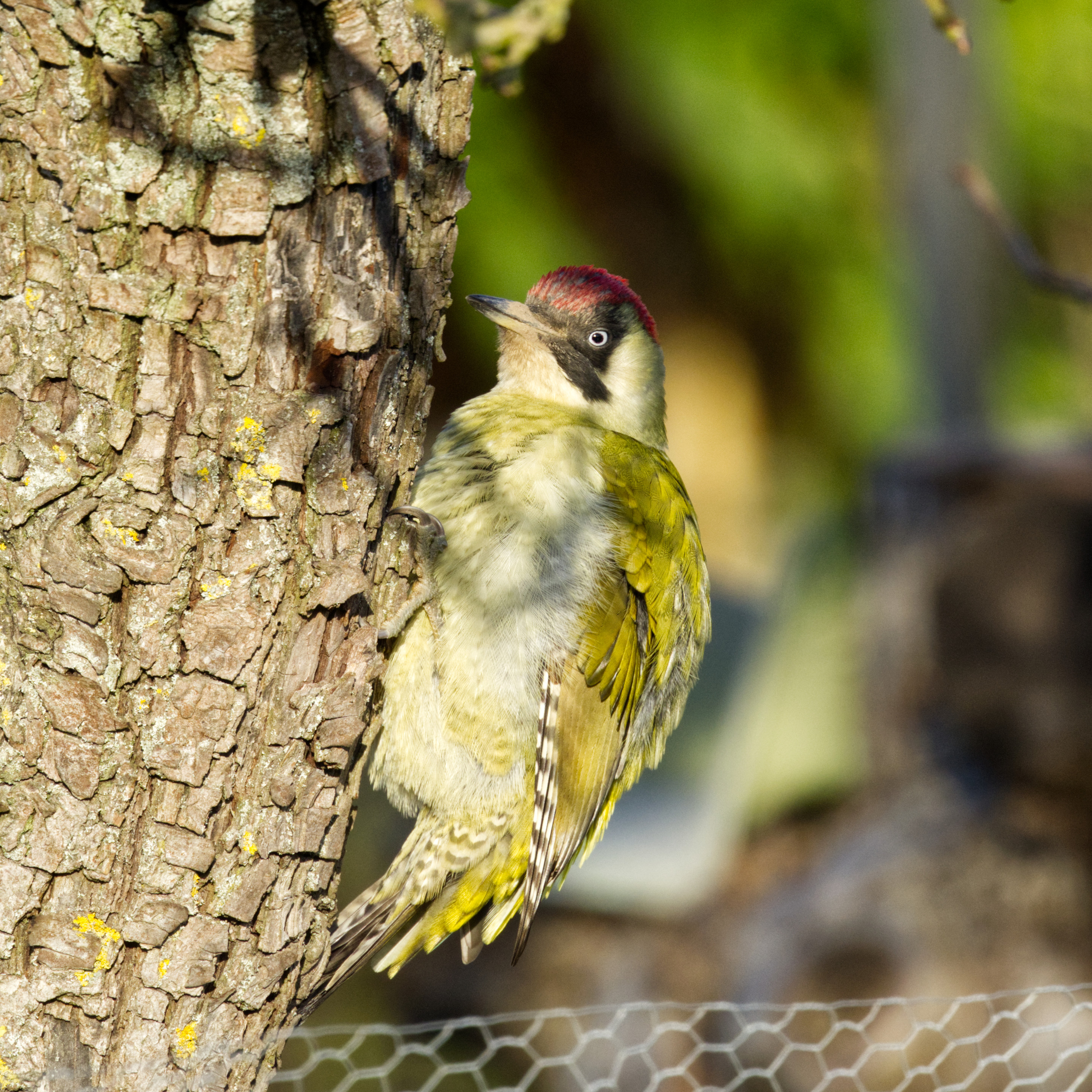 Ein Grünspecht-Weibchen (Picus viridis) hängt an einem Apfelbaum. Der Betrachter sieht ihn im Profil. Der Grünspecht wird bis zu 32 Zentimeter lang und hat eine Flügelspannweite von bis zu 52 Zentimetern. Die Oberseite ist dunkelgrün, die Unterseite ist blass hell- bis graugrün gefärbt. Der Kopf ist an den Seiten durch eine schwarze Gesichtsmaske gezeichnet, die vom Schnabel bis hinter die Augen reicht. Der Oberkopf und der Nacken sind rot, der Bürzel grüngelb. Die Ohrgegend, Kinn und Kehle sind dagegen weißlich. Die Flügel oder Schwingen der Tiere sind braunschwarz, gelblich oder bräunlichweiß gefleckt. Die Steuerfedern sind auf grüngrauem Grund schwärzlich gebändert. Die Unterschiede zwischen den Geschlechtern sind gering, beim Männchen ist der Wangenfleck rot mit einem schwarzen Rand, beim Weibchen ist dieser Wangenfleck einfarbig schwarz. Die Augen des Grünspechts sind bläulichweiß, Schnabel und Füße sind bleigrau.