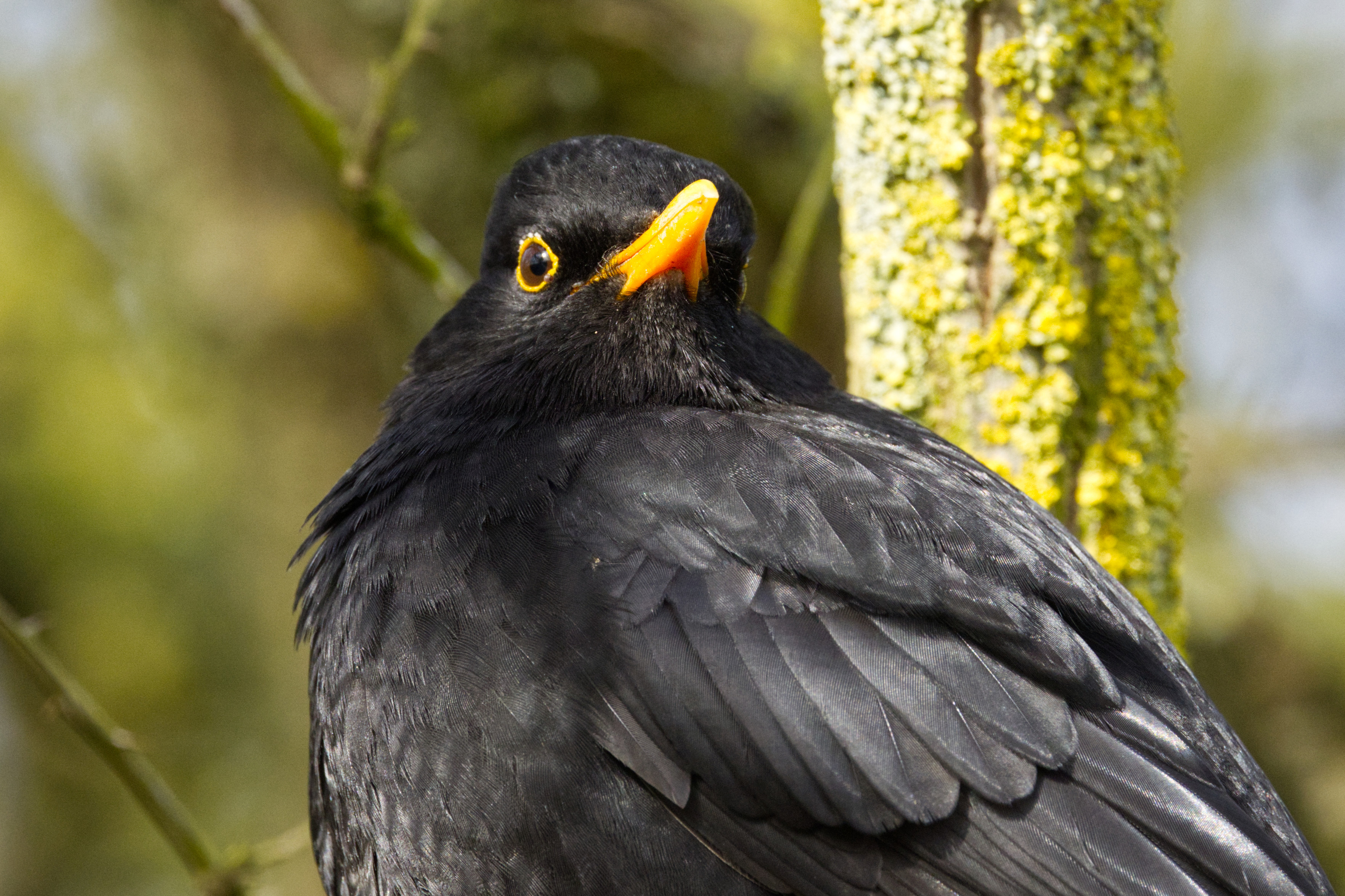 Nahaufnahme eines Amsel-Männchens (Turdus merula). Zu sehen ist die obere Hälfte des aufgeplusterten Körpers von der Seite. Der Kopf ist weit nach links gedreht und leicht angehoben, so daß man das rechte Auge und die Unterseite des Schnabels erkennt. Das Gefieder des Vogels ist komplett schwarz. Er hat einen orangefarbenen Schnabel, gelbe Augenringe und graubraune Beine.