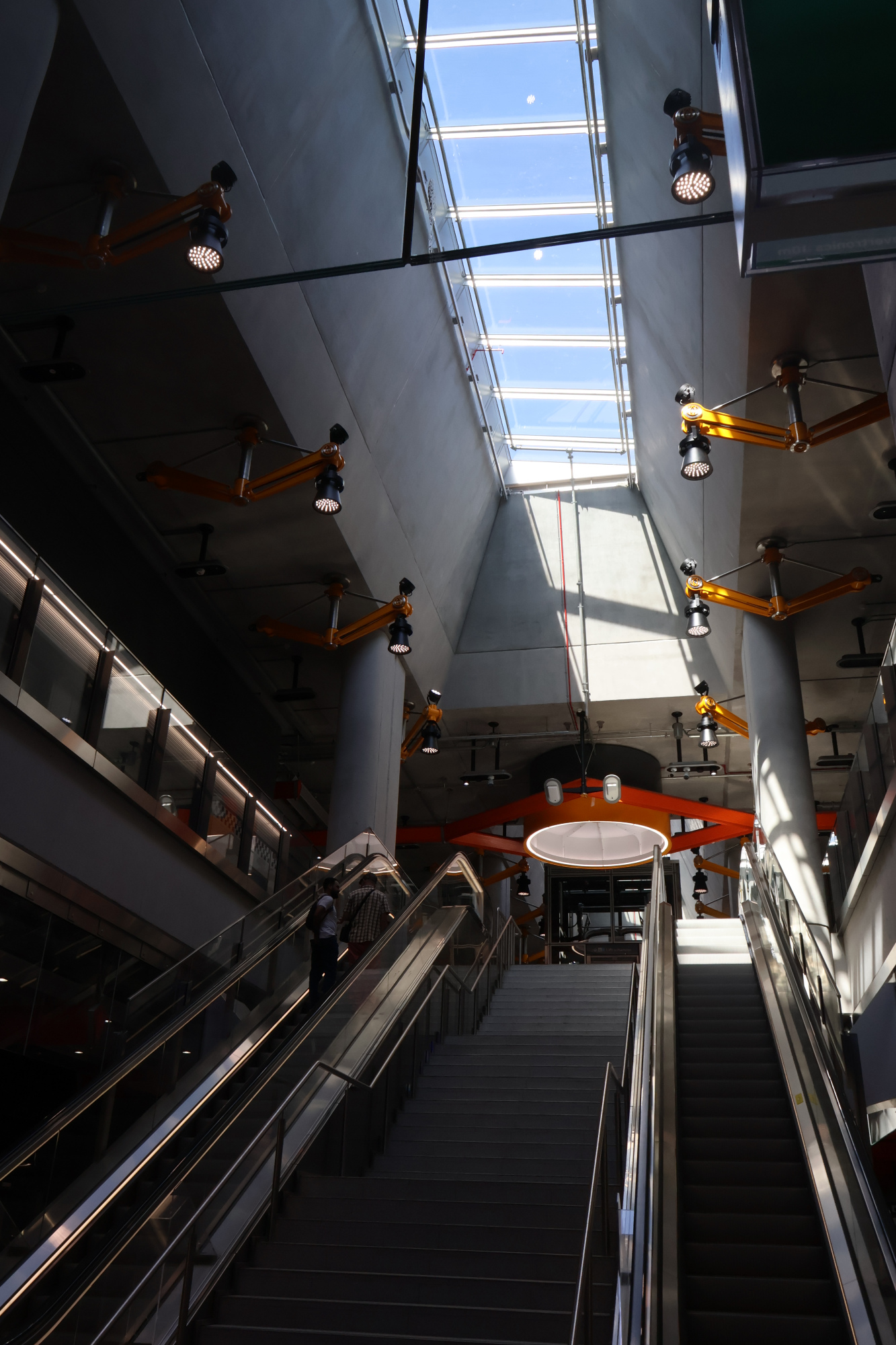 Showing the view from the platform up to the concourse level with the glass roof in view, beaming sunlight down to the platforms.