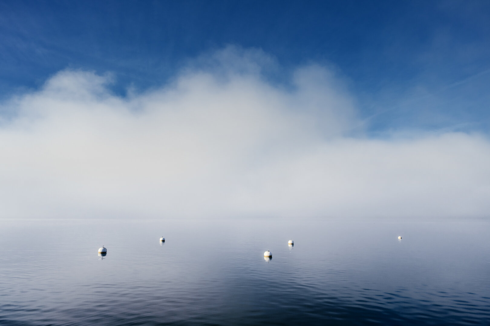 Eine ruhige Szene auf dem Thunersee, wo eine dichte Nebelbank die Horizontlinie verschleiert. Mehrere weiße Bojen sind auf der spiegelglatten Wasseroberfläche verteilt, die das tiefe Blau des Himmels widerspiegelt. Der obere Bildbereich zeigt einen