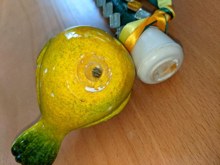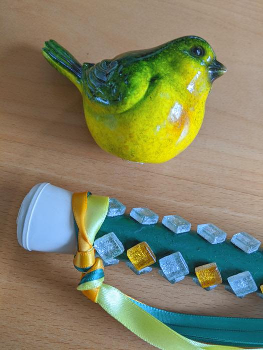 For a local festival I am the Wattle Fairy Godmother. After seven years the ceramic bird on the top of my magic staff came off. I cannot remember what glue I used. So last year I used something people suggested and it lasted only a day. Does anyone know how I can more permanently stick ceramic to rubber?