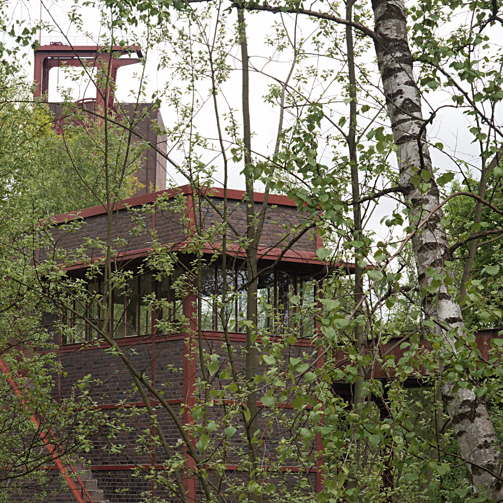 Quadratisch und farbig. Industriegebäude, dunkelroter Backstein. Davor und dahinter ergrünender Birkenwald.