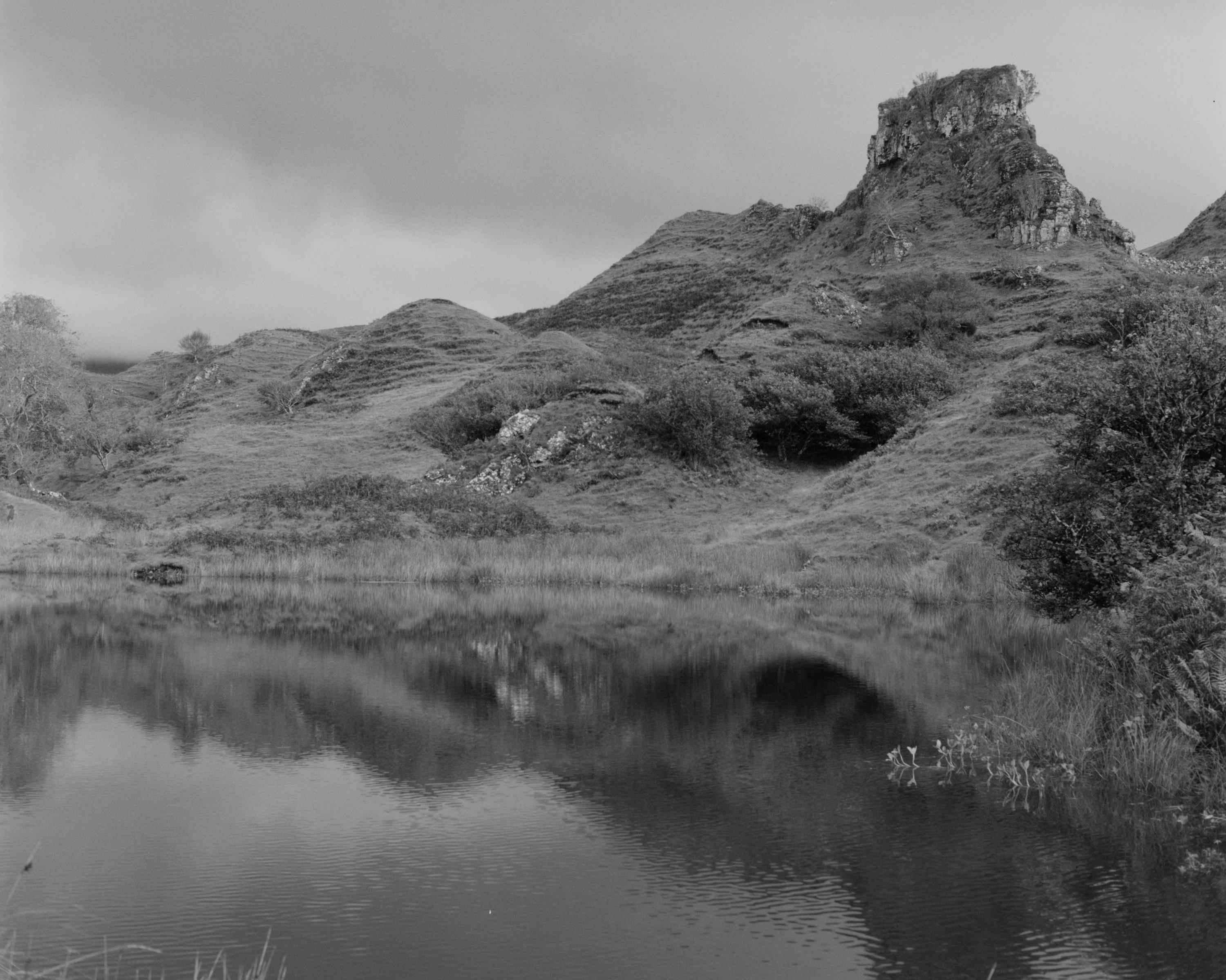 Yashica MAT124G | Ilford HP5 Plus 400 | Shot at 320 + Med Yellow Filter | Developed in XTOL A tall castle-like rock feature viewed from across a small pond, in which it is also reflected