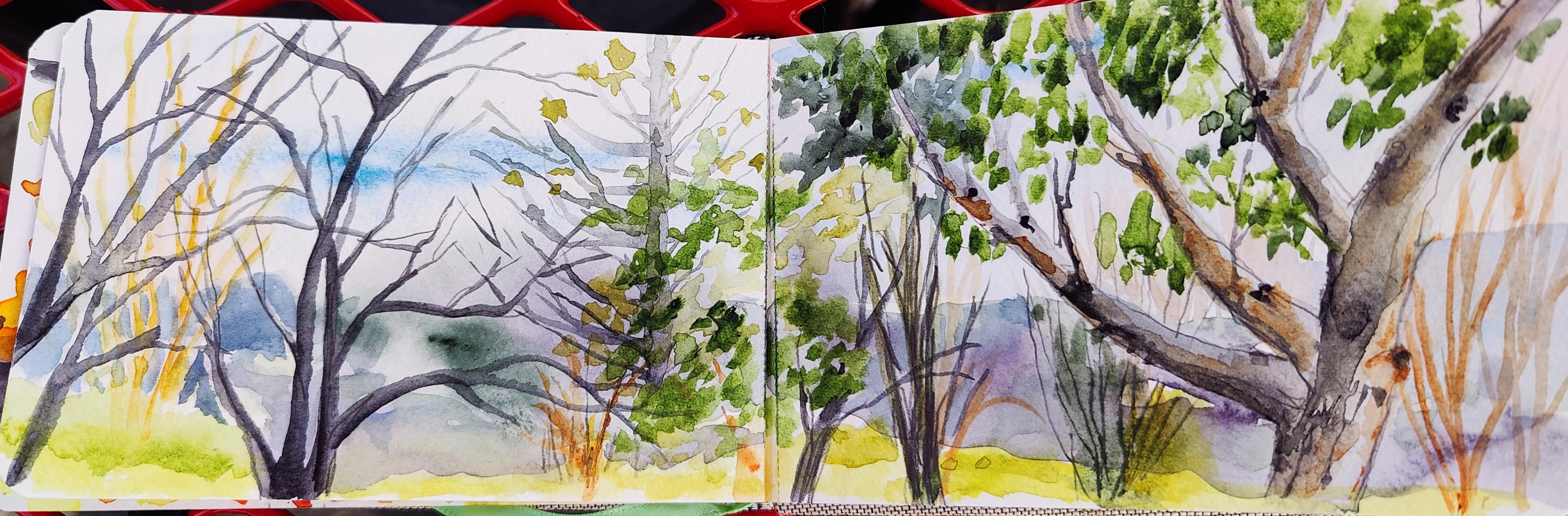 A late winter early spring landscape across two pages of a sketchbook.