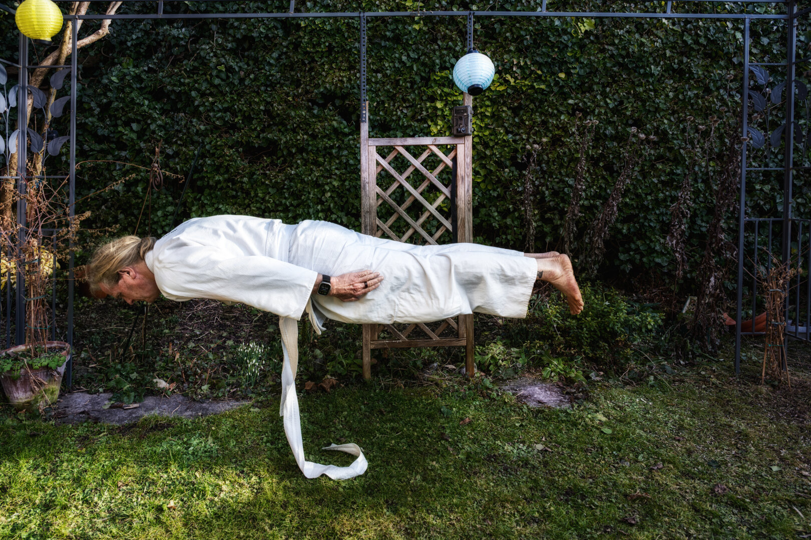 Ein Mann in einem weissen Kampfsportanzug schwebt vollkommen horizontal in der Luft. Er befindet sich in einem Garten vor einer dichten grünen Hecke. Seine Arme liegen eng am Körper, die Hände auf den Oberschenkeln, der Blick ist konzentriert nach unten gerichtet. Ein langes Ende seines weissen Stoffgürtels hängt bis zum Rasen hinunter und bildet eine geschwungene Linie. Im Hintergrund sind ein hölzernes Rankgitter und zwei bunte Papierlampions an einem Metallgestell zu sehen. Das Sonnenlicht fällt von links ein und wirft Schatten auf den grünen Rasen.