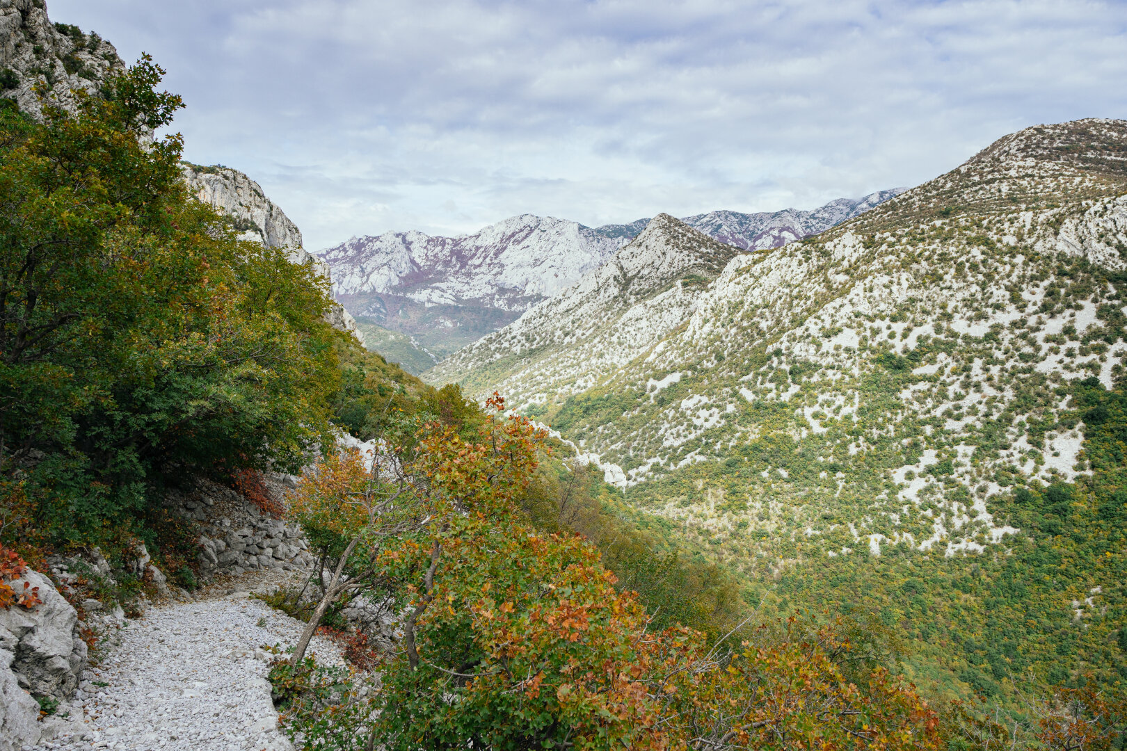 A path in the mountains, with limestone mountains in the background that look as if they were covered with snow, and lots of greenery in various colors everywhere. Light falls differently on mountains.