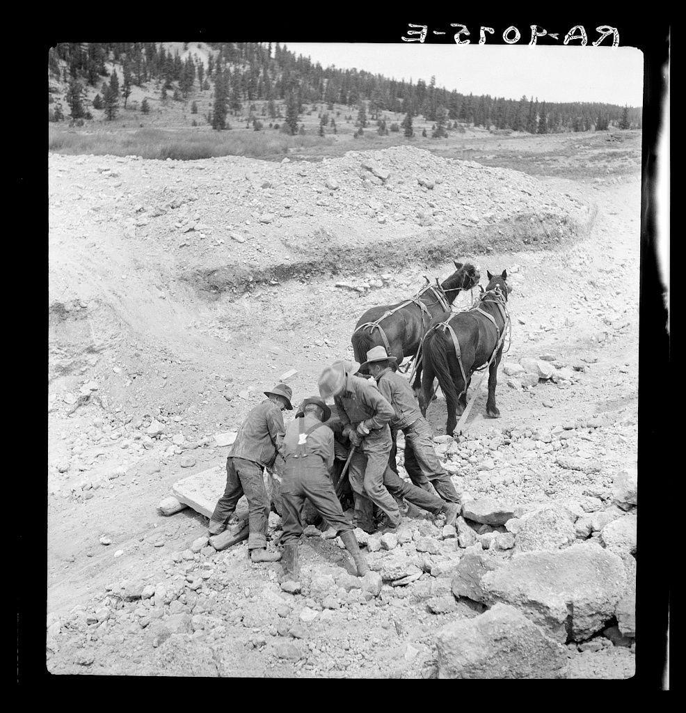 Widtsoe land use adjustment project. Garfield County, Utah. Loading boulder on stone boat, while excavating new spillway of Tropic Dam
