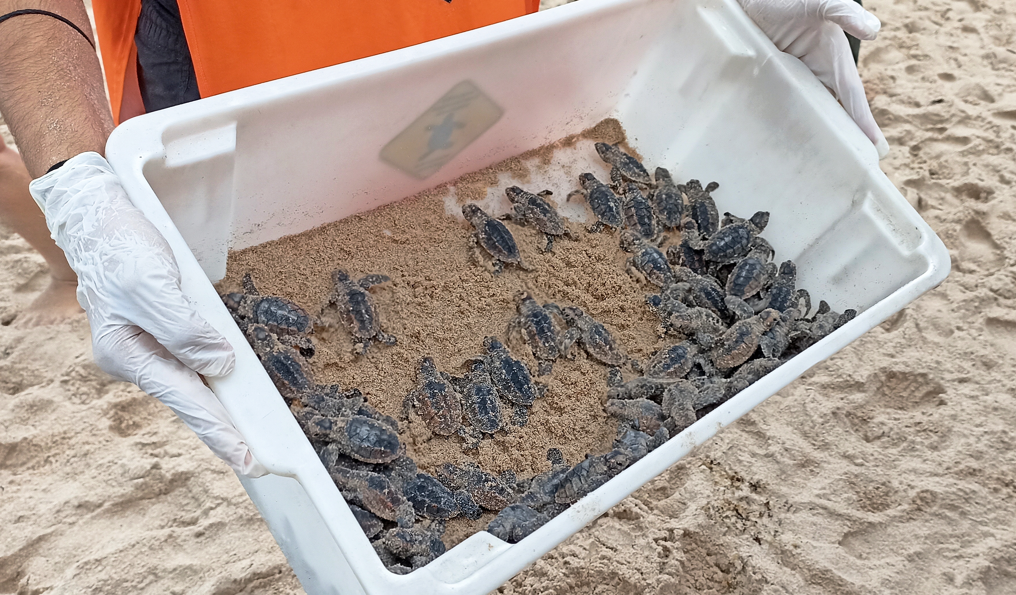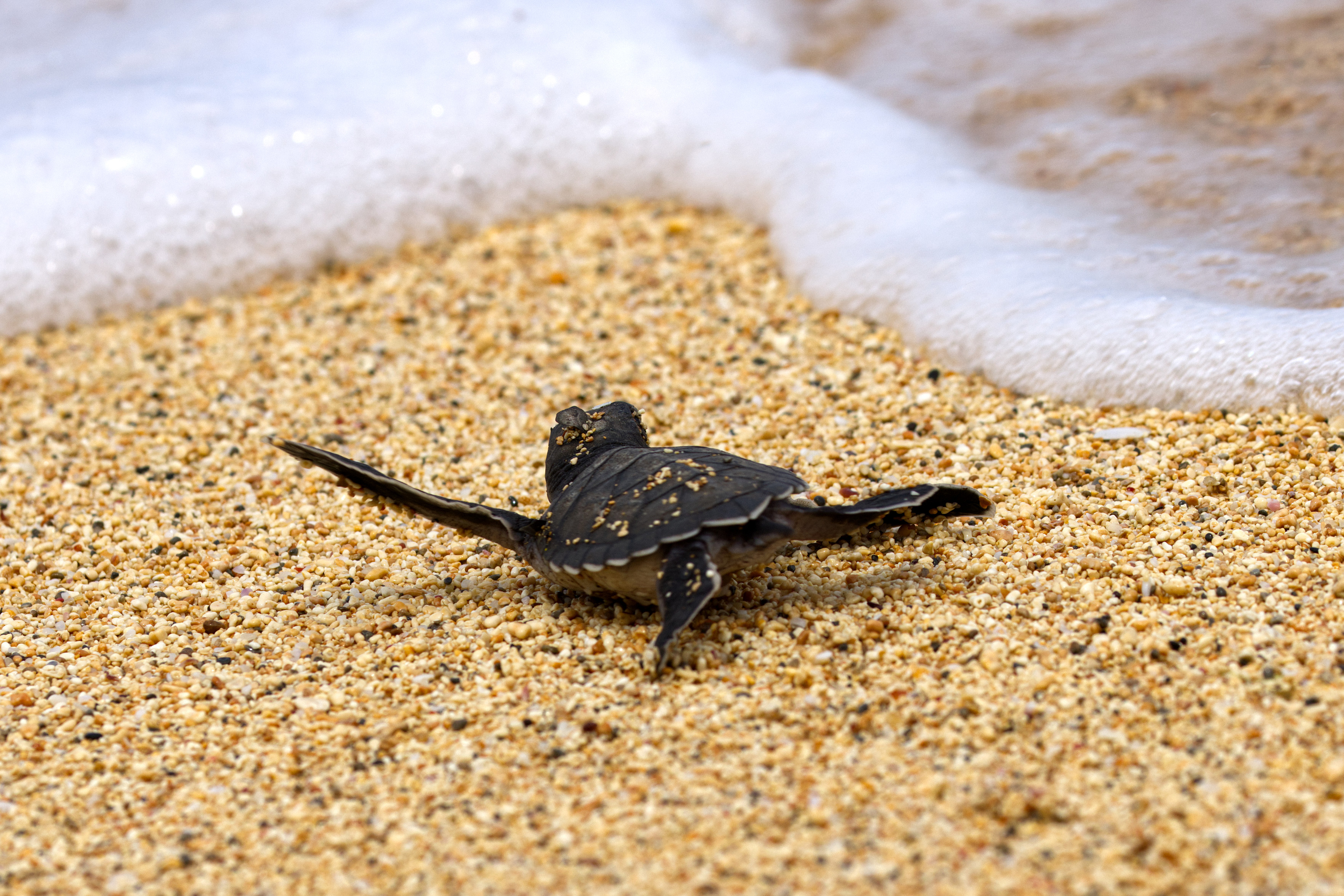 Mit ein klein wenig Hilfe von uns haben es die kleinen Schildkröten-Babys bis ins Wasser geschafft.