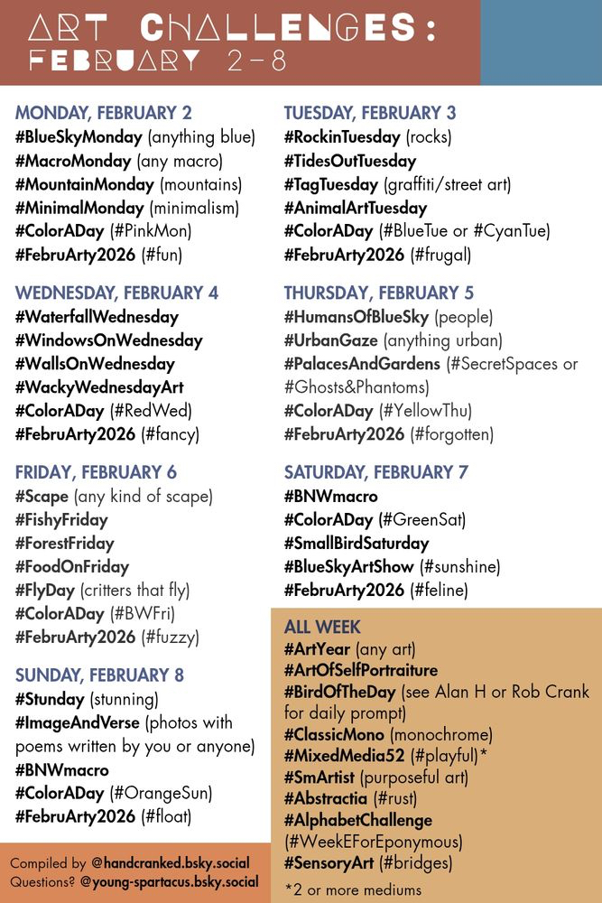 Your art challenge cheat sheet for February 2-8 is here! See comments for host list. Compiled by Robyn @handcranked.bsky.social@bsky.brid.gy #EastCoastKin #Photography #Art #Drawing #Painting #ArtChallenge