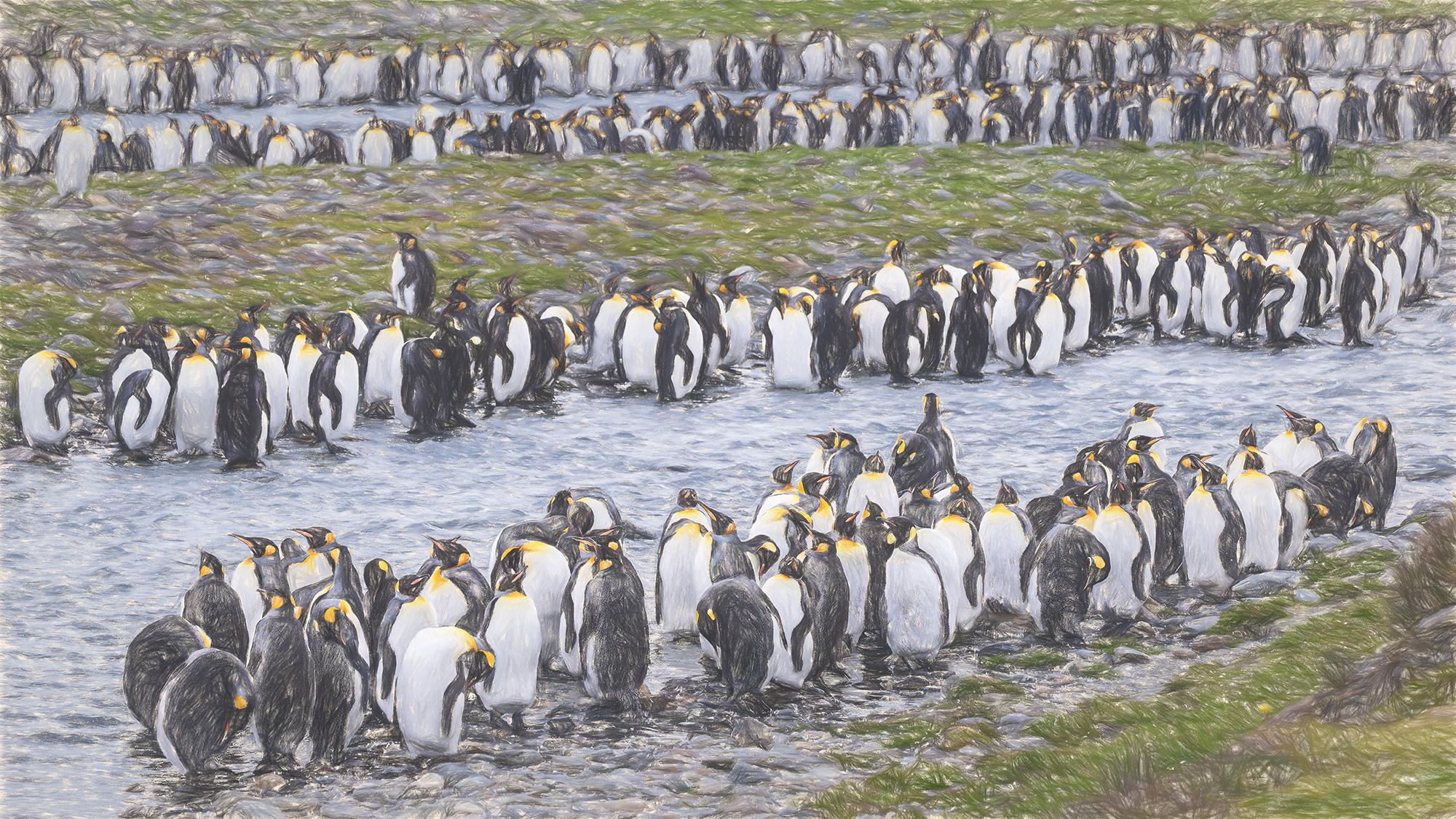 An artisitic rendering of a colony of king penguins lining both sides of a glacial stream.