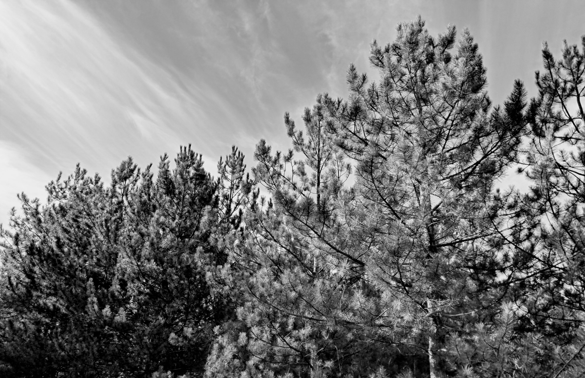 A black and white photograph captures the tops of several pine trees against blue sky filled with wispy streaking clouds. The dense needle-filled branches dominate the bottom and right side of the frame, creating high contrast with deep shadows and bright highlights. The clouds in the upper left corner stretch diagonally, adding a sense of movement above the textured canopy. 67e4280a-316e-4cba-8cda-1a8c492b9ad7
