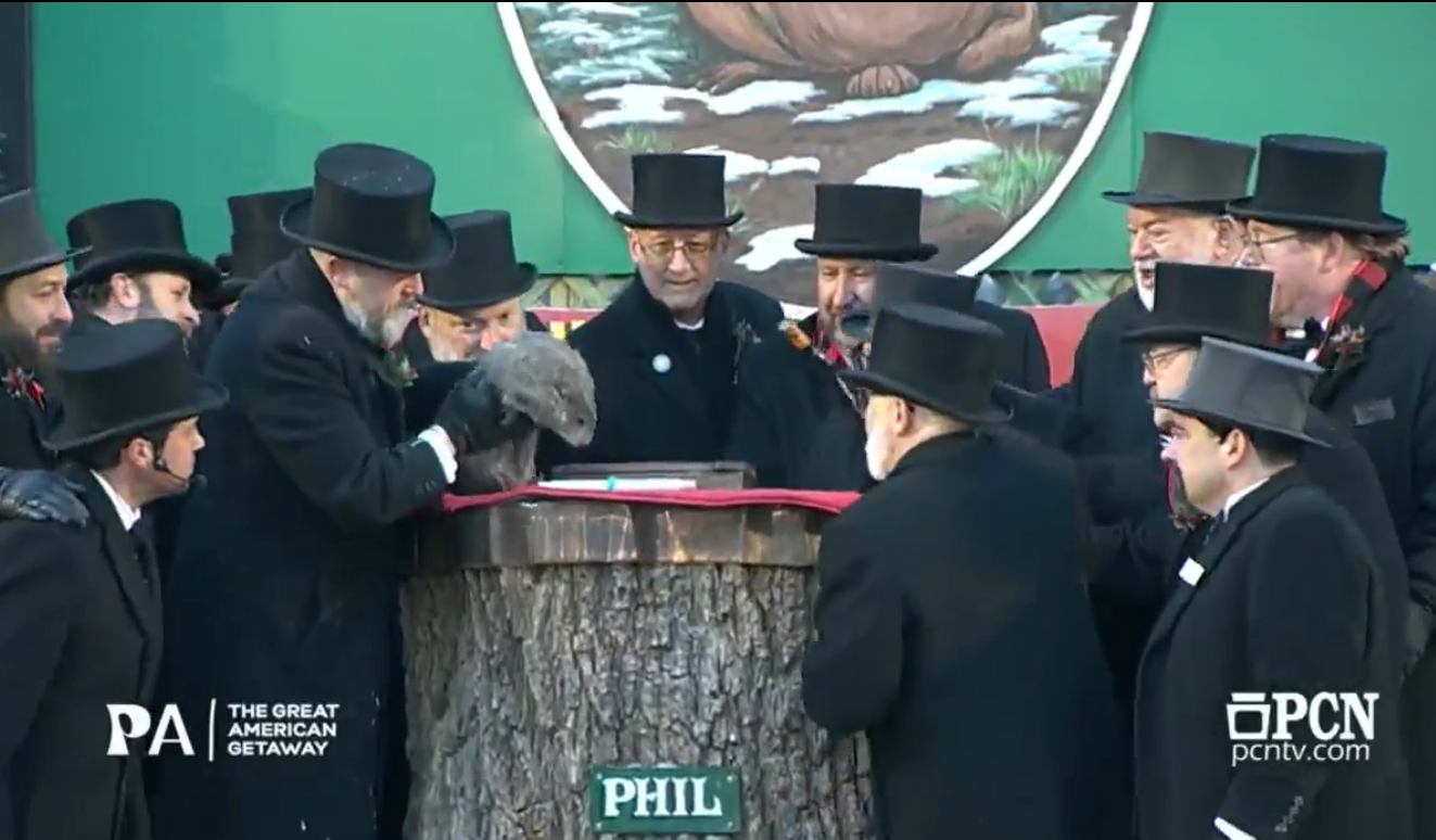 Color image of Groundhog Day at Punxsutawney, Pennsylvania, USA, as Phil the Groundhog sees his shadow, forecasting six more weeks of winter. Image is a screen shot of the PCNTV.com live feed from the event, showing the handlers, all in black top hats and tails, holding the groundhog as it selects the scroll that contains the forecast.