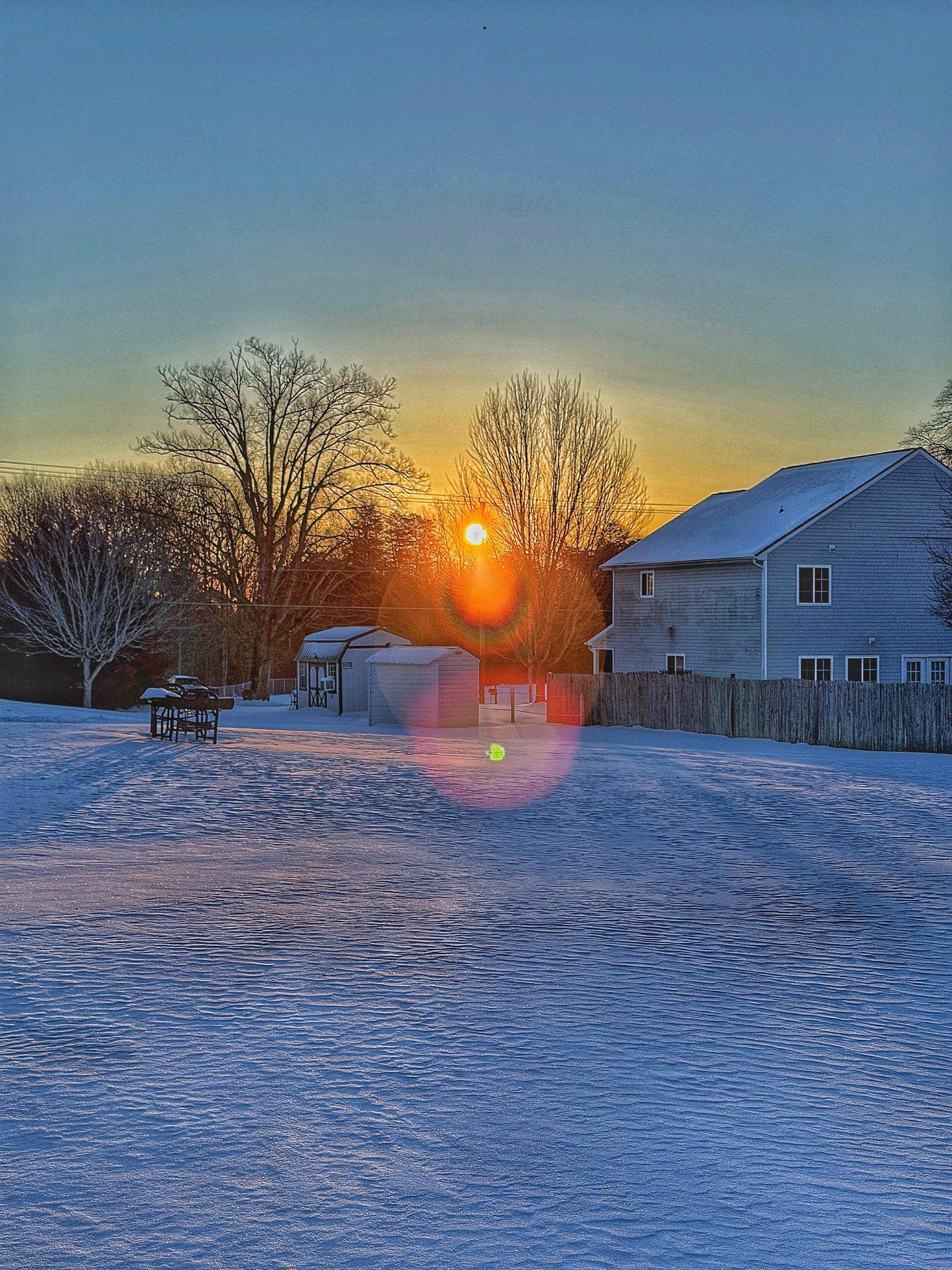 Snow-covered backyard at sunset with rippled snow in the foreground, bare trees and a small shed near the center, and a two-story house with a fenced yard on the right; the low sun sits near the horizon with visible lens flare in a clear sky.