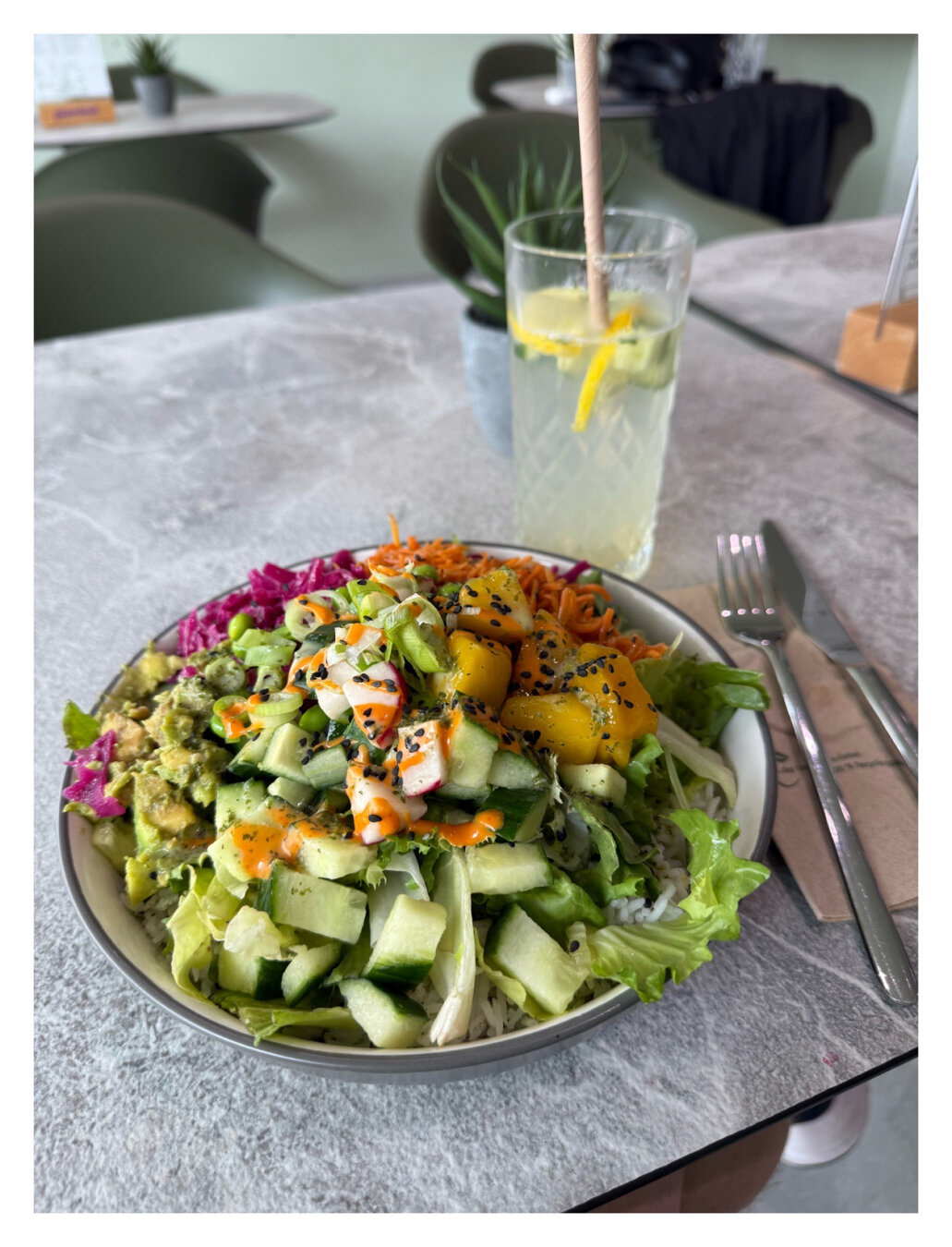 Foto im Hochformat. Auf einem Tisch steht ein runder Teller, eine Bowl gefüllt mit Gemüse. Unter anderem Salatgurke, Karotten, Rotkraut, Salat, Radieschen, Edamame. Darunter ist Reis, den man aber nicht sieht. Hinter der Bowl ist ein Glas mit einer trüben Flüssigkeit und Zitronestücken.