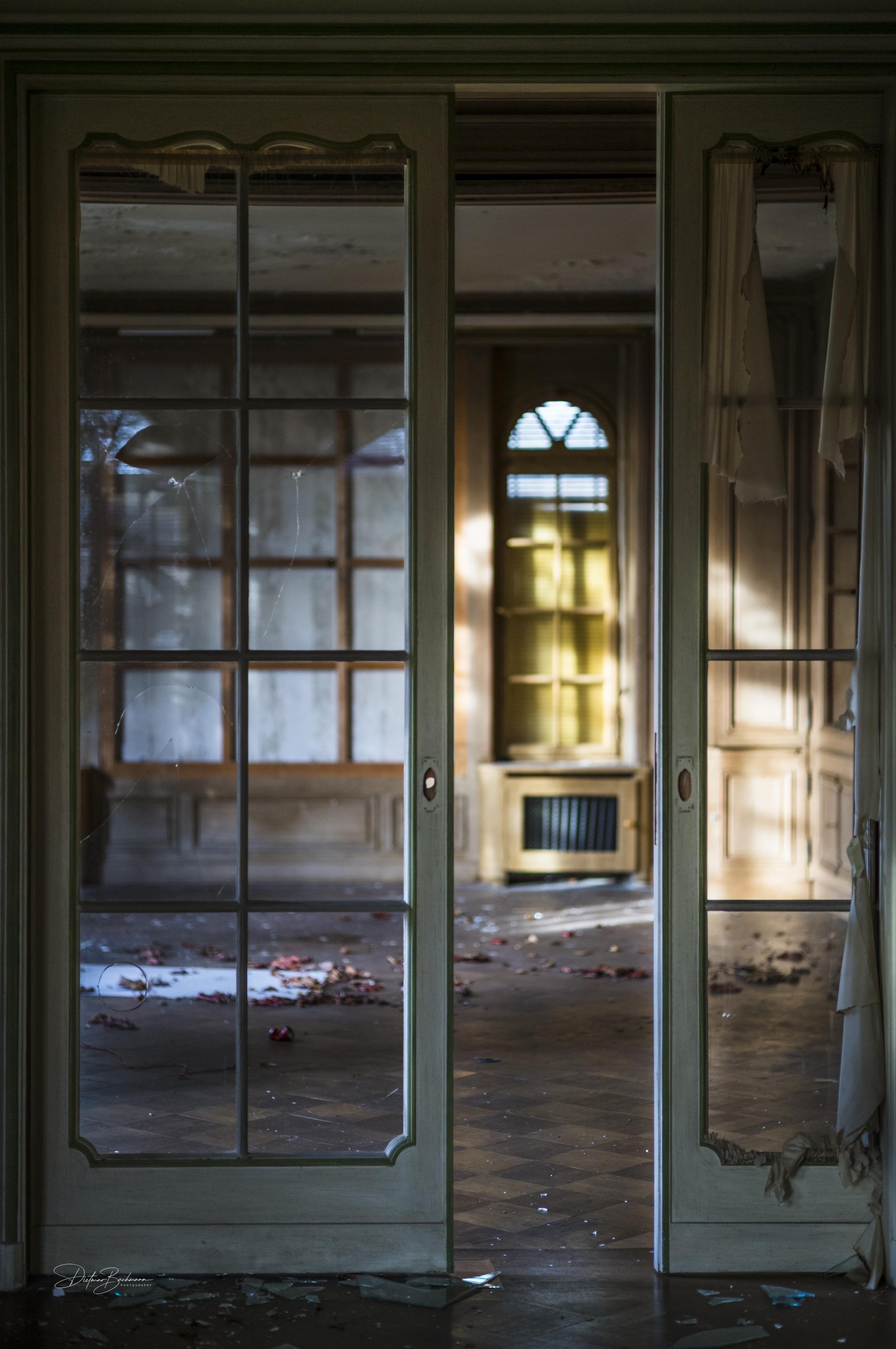 The image shows a doorway with glass panes, leading into an abandoned room. Inside, there is scattered debris, including fallen leaves. The room features a large window with decorative elements, and light spills in, highlighting the debris and architectural details of the interior.