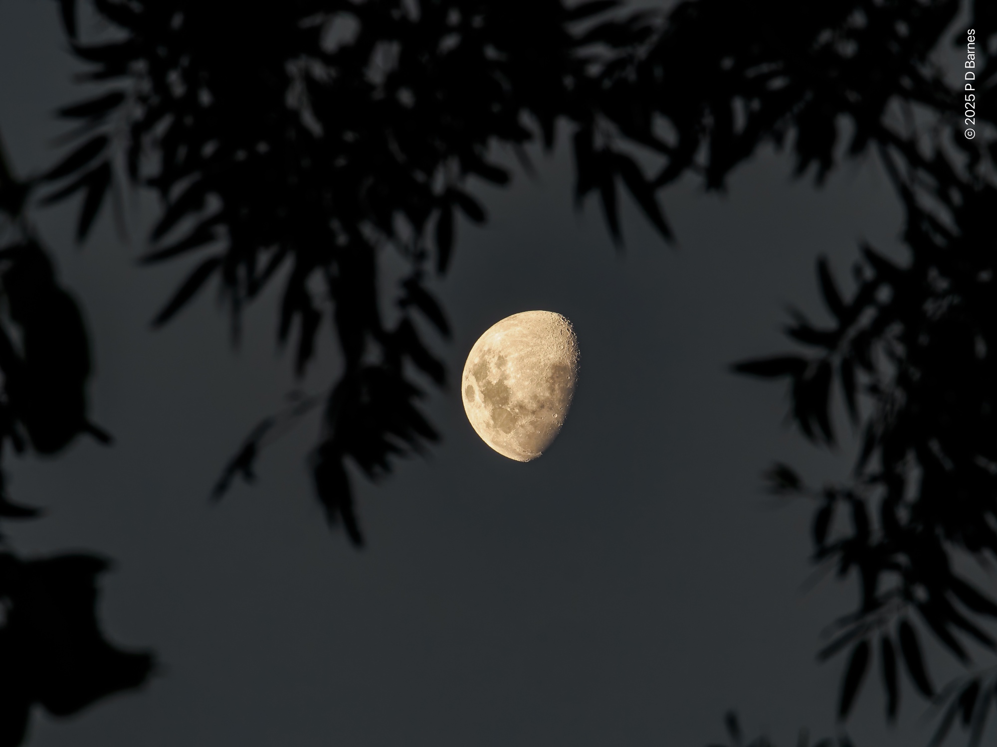 A gibbous three-quarter moon framed by out-of-focus leaves and branches of a eucalypt.