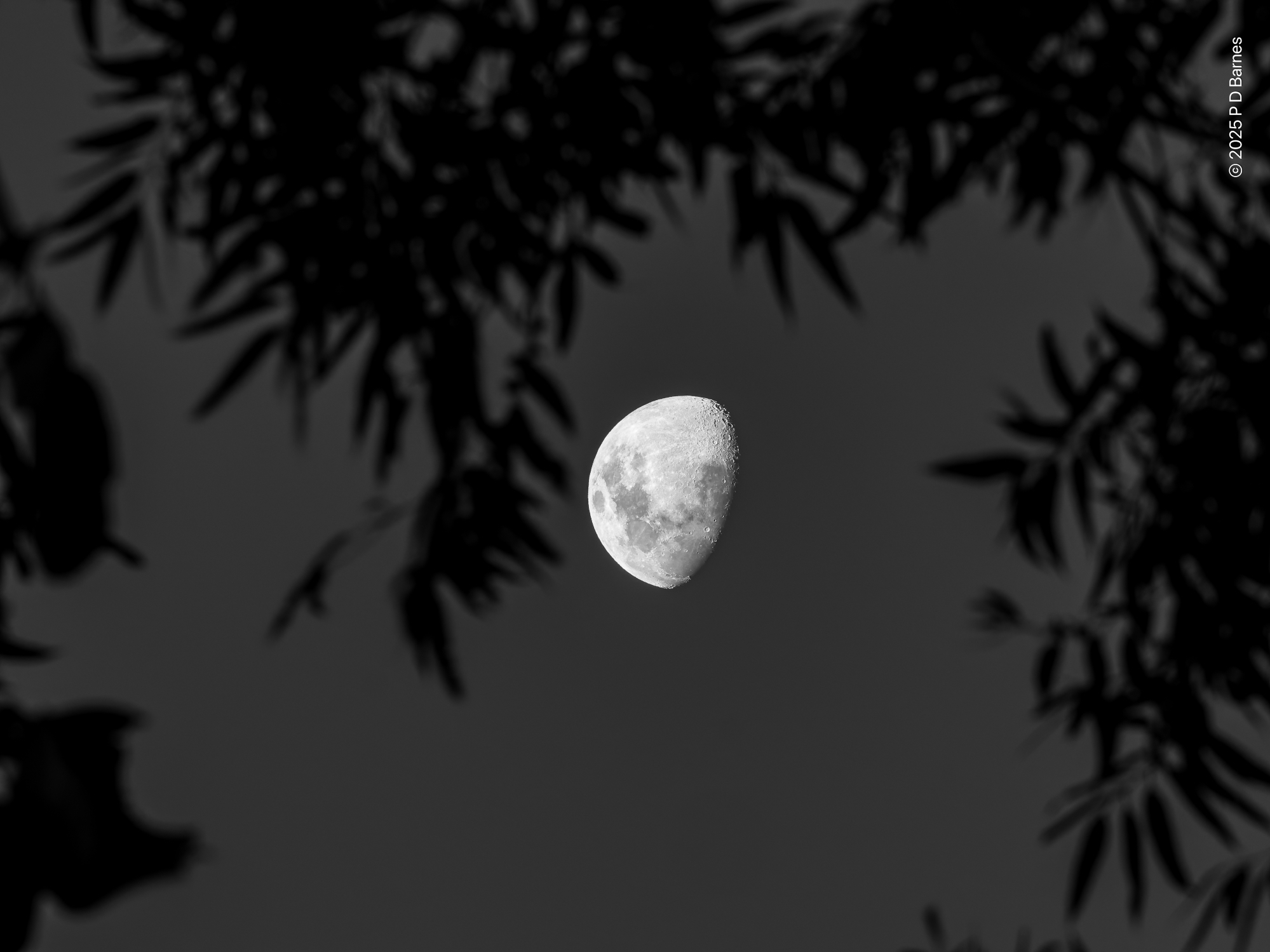 A gibbous three-quarter moon framed by out-of-focus leaves and branches of a eucalypt. Pure monochrome version.