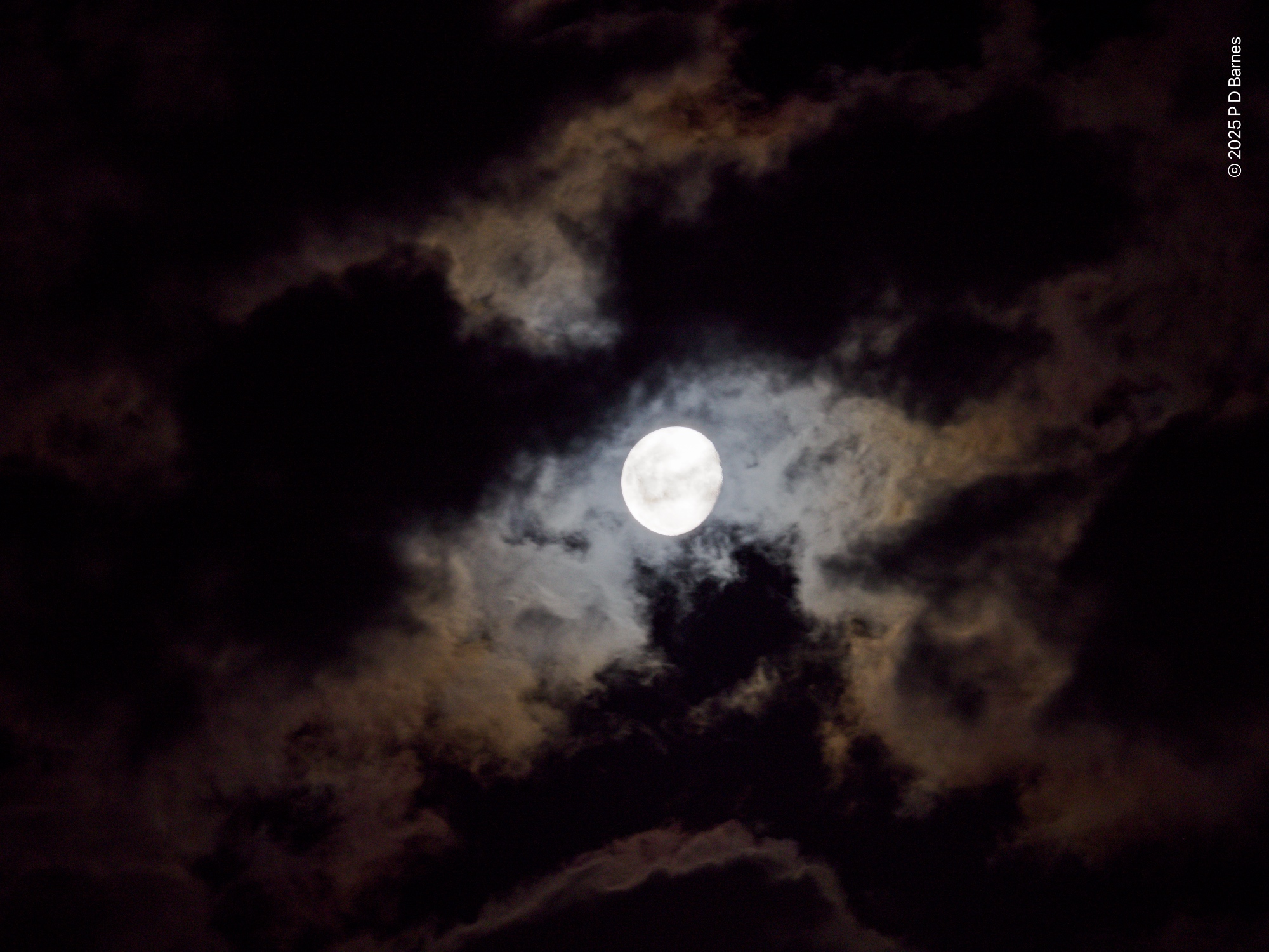 A gibbous, nearly full moon partially obscured by drifting clouds of various densities.