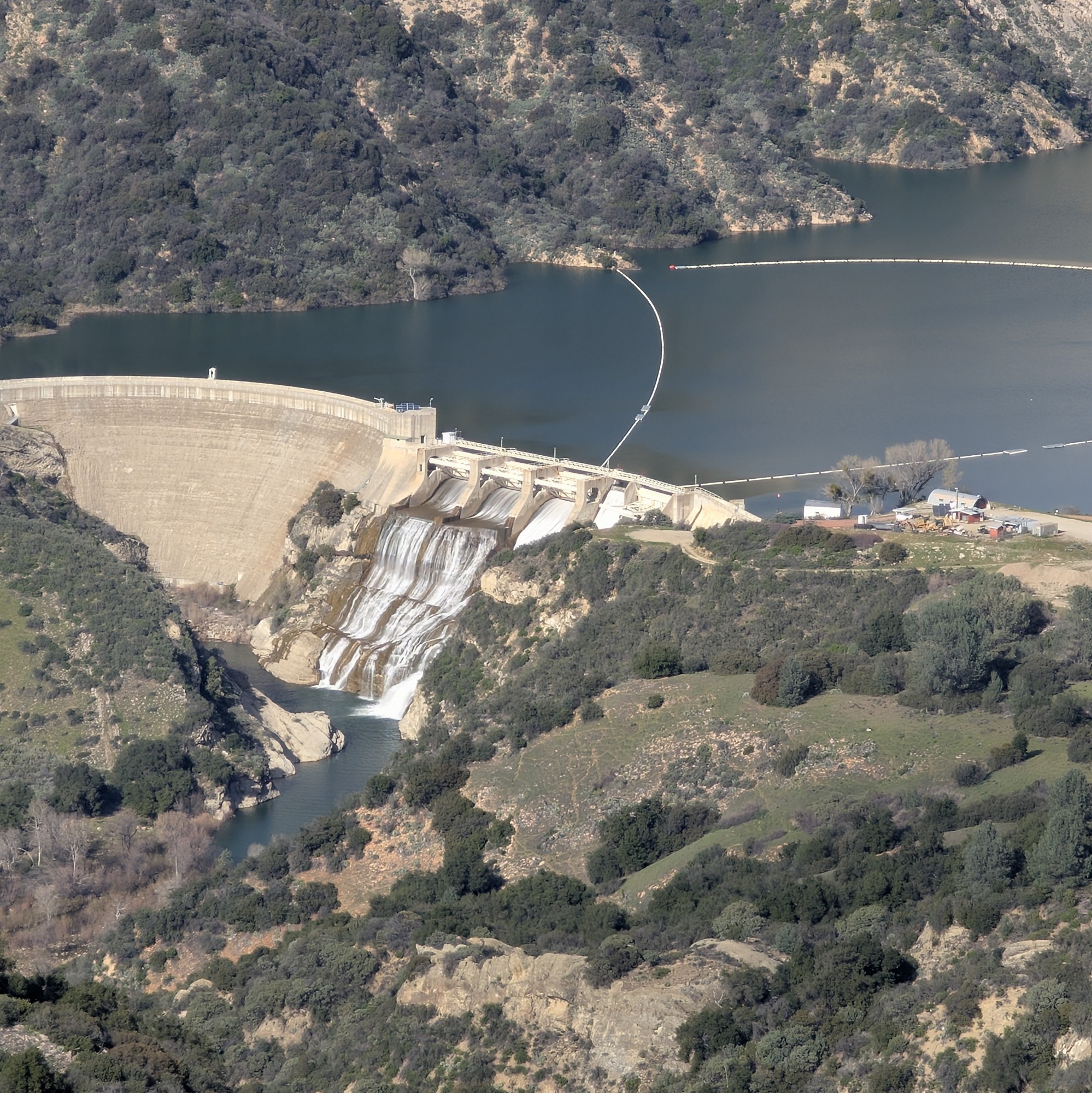 Gibraltar Reservoir behind Santa Barbara, CA is full and flowing over the dam.