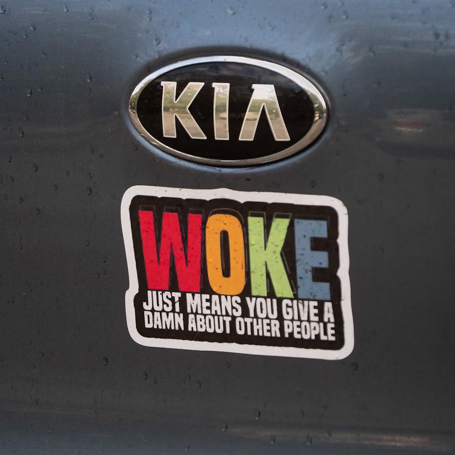Bumper sticker seen on a parked KIA It reads: "WOKE - Just means you give a damn about other people"