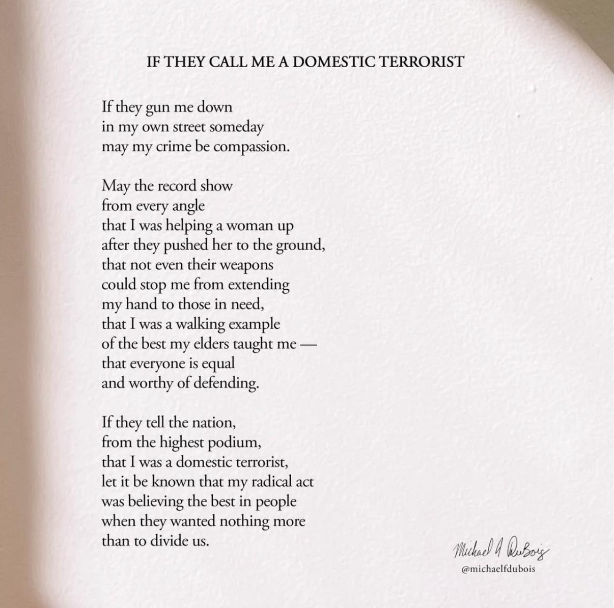 These are the opening lines of a powerful poem by Michael Dubois entitled "If They Call Me a Domestic Terrorist" and featured by Joyce Vance today. See below for the entire poem.