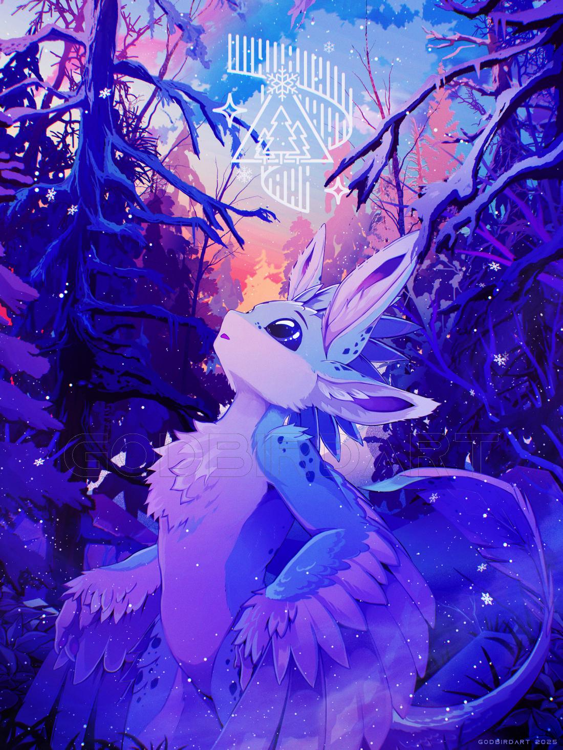 alt image is a digital portrait of an anthropomorphic avali character looking up in wonder at the tall, snowy silhouettes of a winter forest. image is a digital portrait of an anthropomorphic avali character looking up in wonder at the tall, snowy silhouettes of a winter forest.