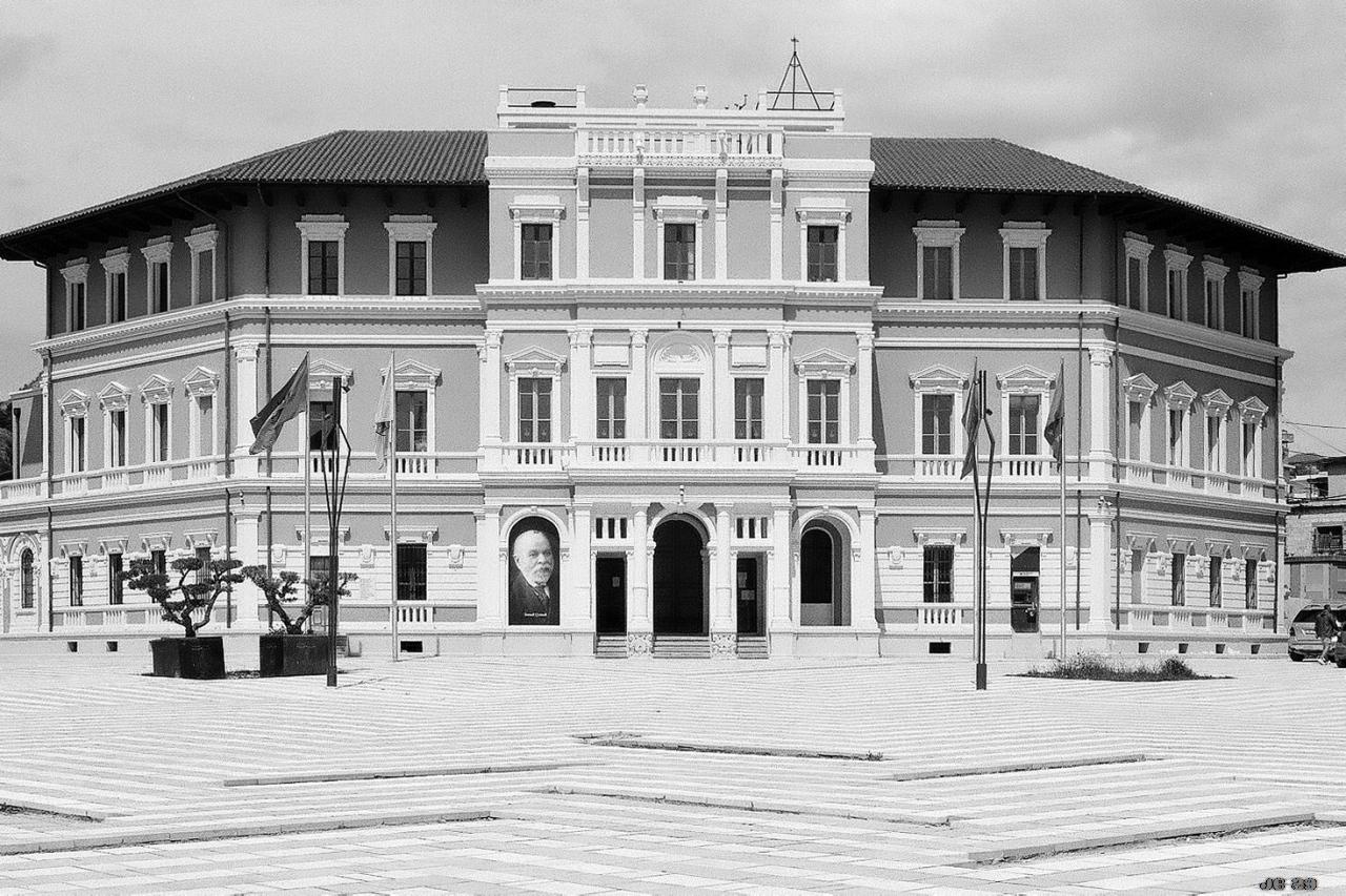 'Fenster(freitag)' - das Rathaus von Vlorë in Albanien #FotoVorschlag #Fenster #Fensterfreitag #Vlorë #Albanien #Architektur #Fotografie #schwarzweiß #Filmfotografie #35mm #believeinfilm #Leica #Ilford #photography #architecture
