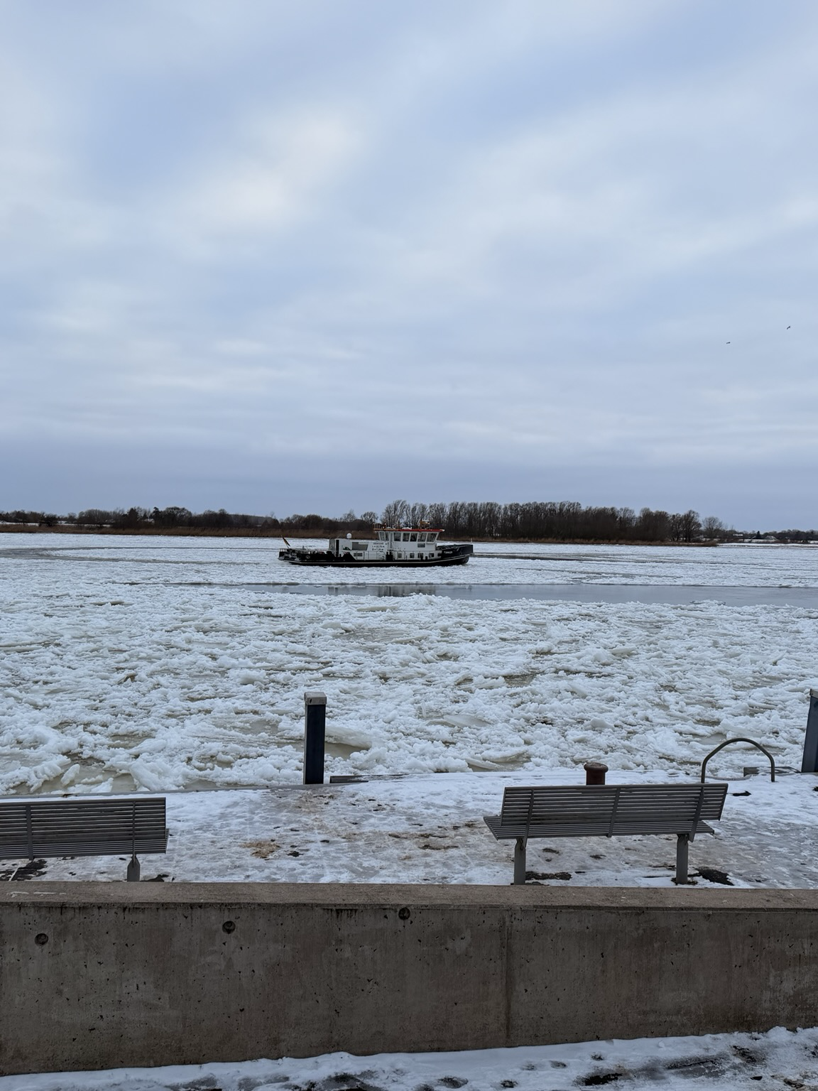 Die Elbe bei Geesthacht wird von einem Schlepper/ Eisbrecher freigehalten. So viel Eisgang habe ich schon lange nicht mehr gesehen.