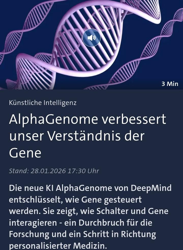 Die neue KI AlphaGenome von DeepMind entschlüsselt, wie Gene gesteuert werden. Sie zeigt, wie Schalter und Gene interagieren - ein Durchbruch für die Forschung und ein Schritt in Richtung personalisierter Medizin. Von Frank Wittig und Ralf Kölbel.