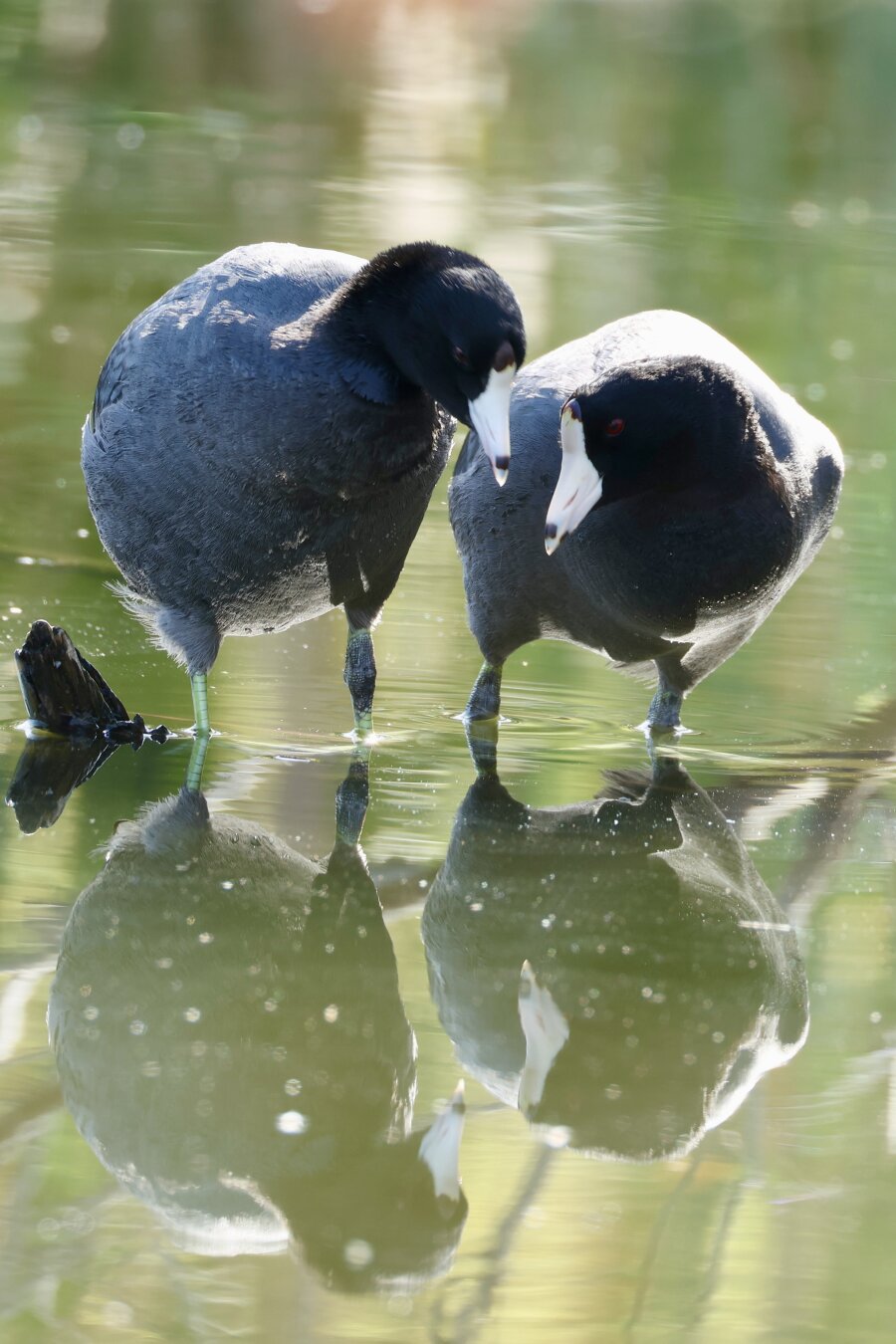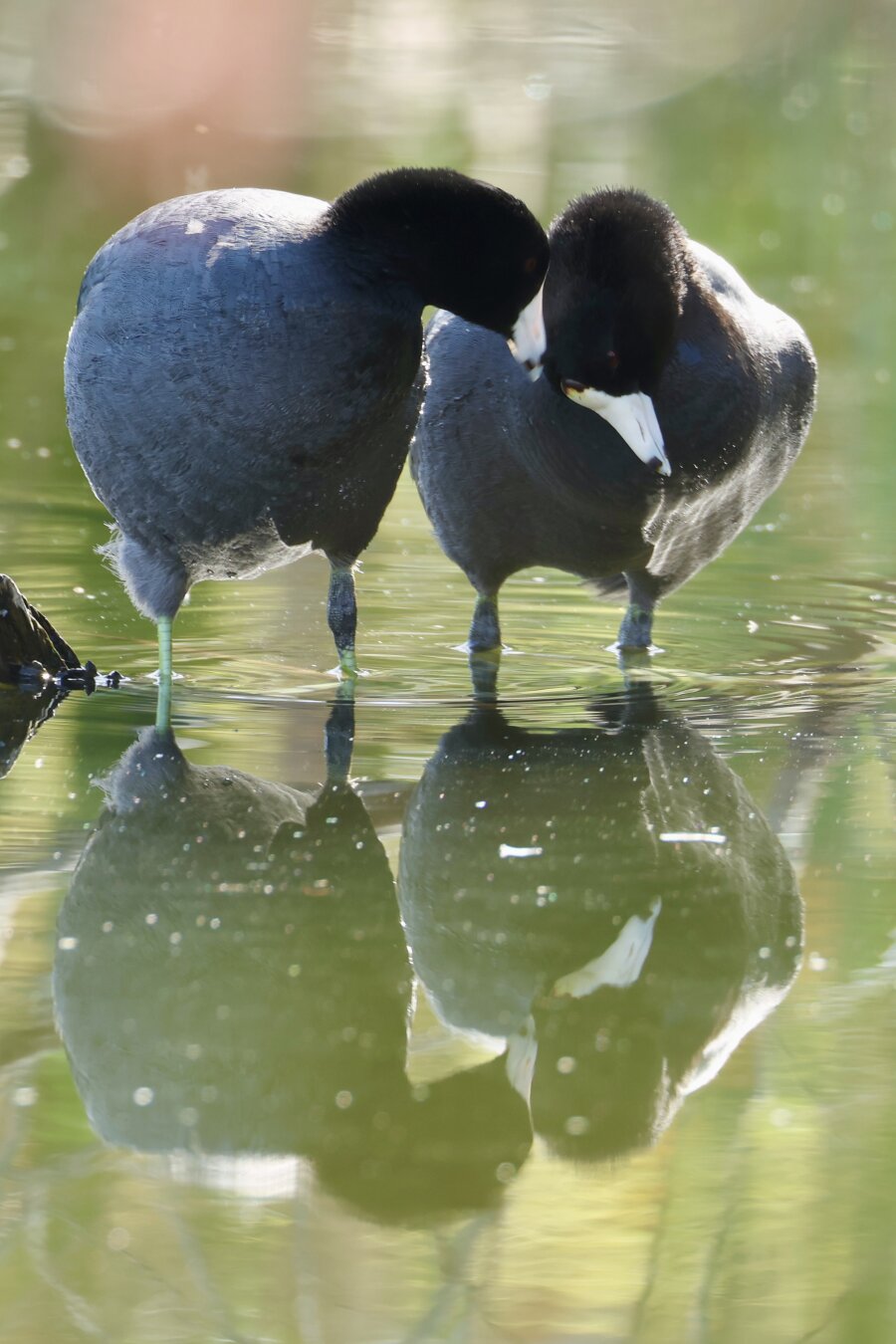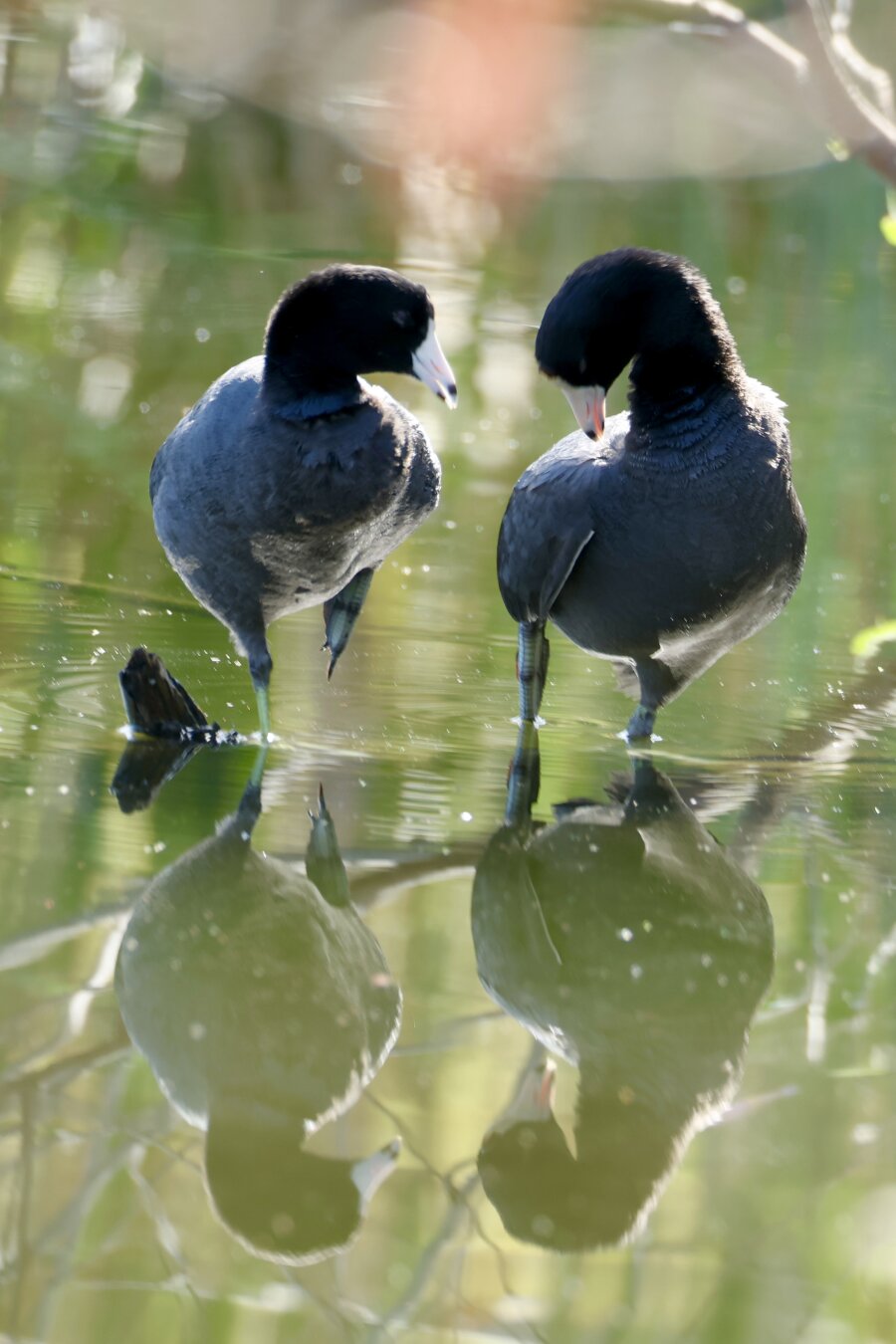 American Coot pair flirts and grooms.