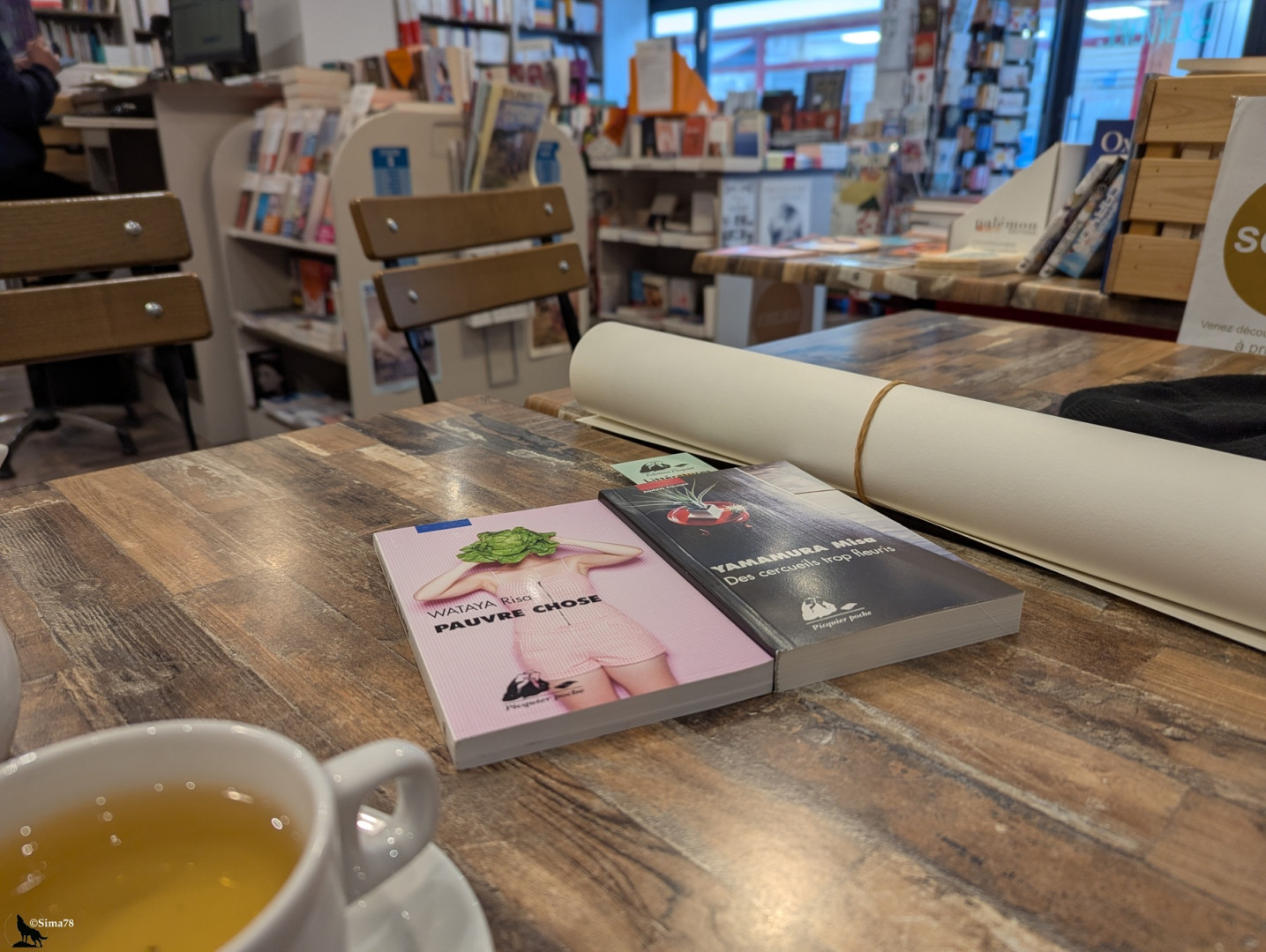 - Vue sur une table style bistro : deux livres, un poster roulé, une tasse de thé et l'atmosphère chaleureuse de ma librairie préférée. - View of a bistro-style table: two books, a rolled-up poster, a cup of tea, and the warm atmosphere of my favorite bookshop. - Vista de una mesa de estilo bistró: dos libros, un póster enrollado, una taza de té y la atmósfera cálida de mi librería favorita.