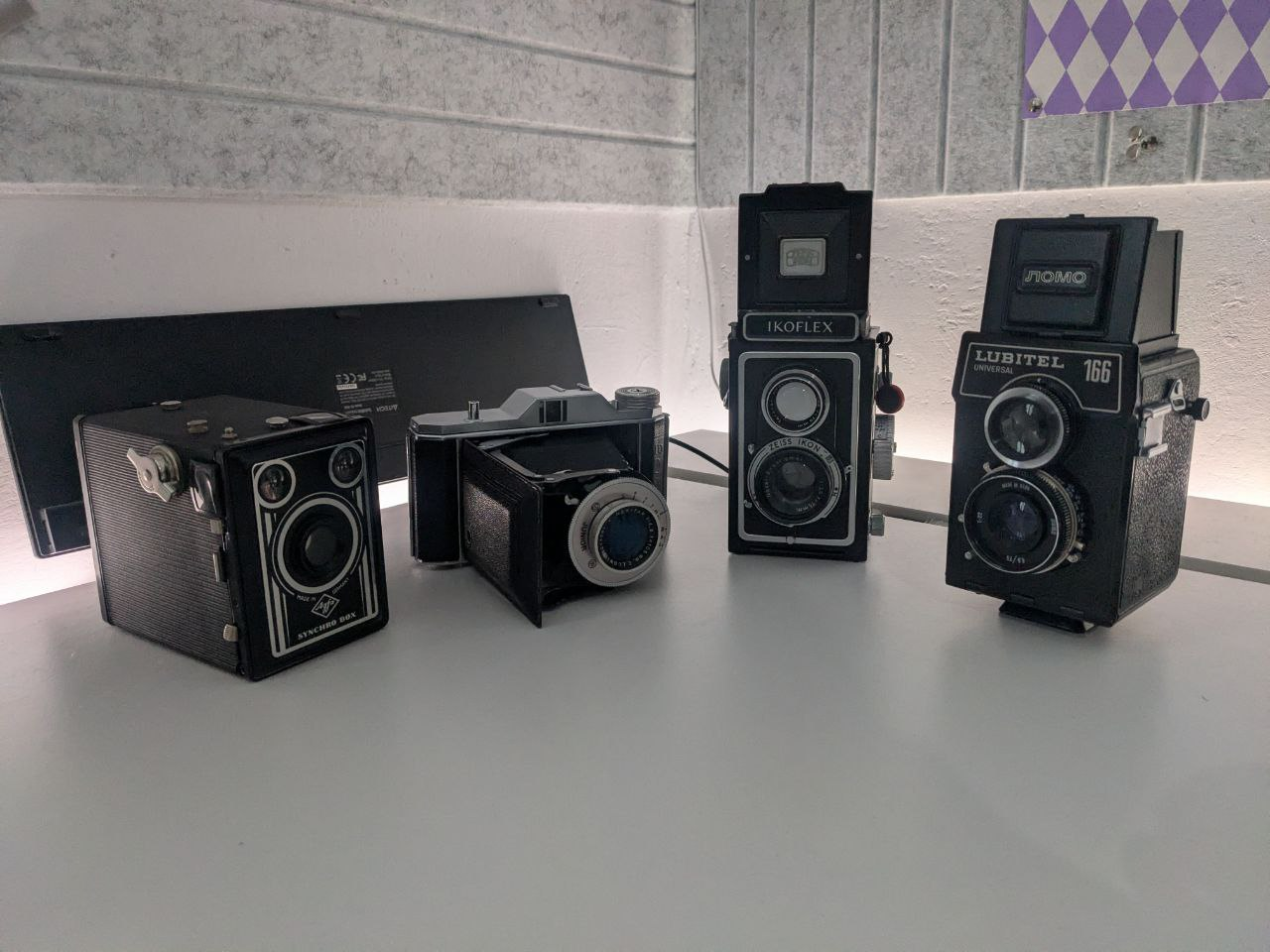 5 aparatów przygotowane do naświetlania, Polaroid EE33 rozpoczął już naświetlanie :)